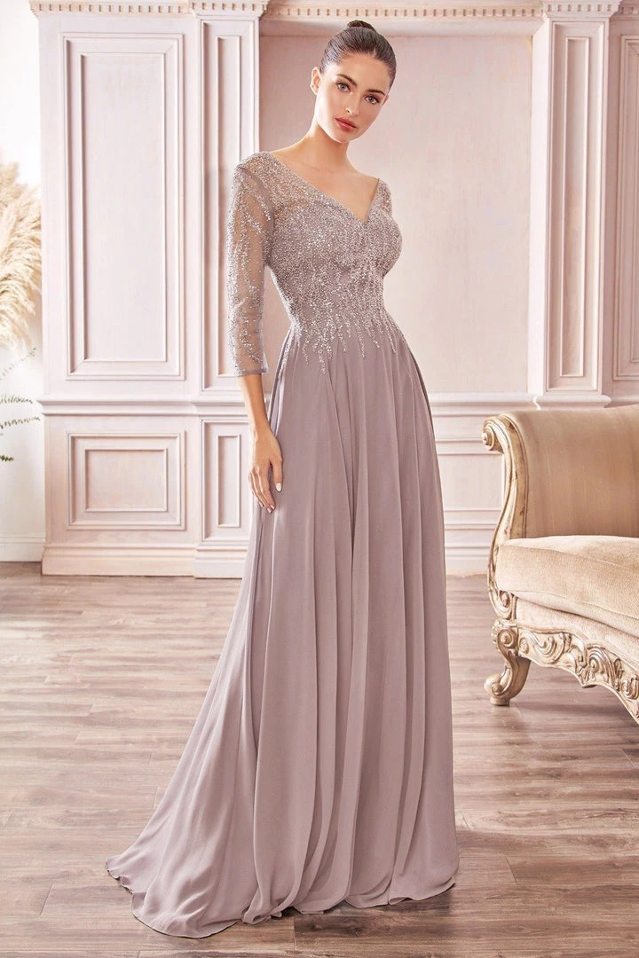 Look timeless in this beaded long A-line chiffon dress with sheer 3/4 sleeves by Cinderella Divine CD0171.