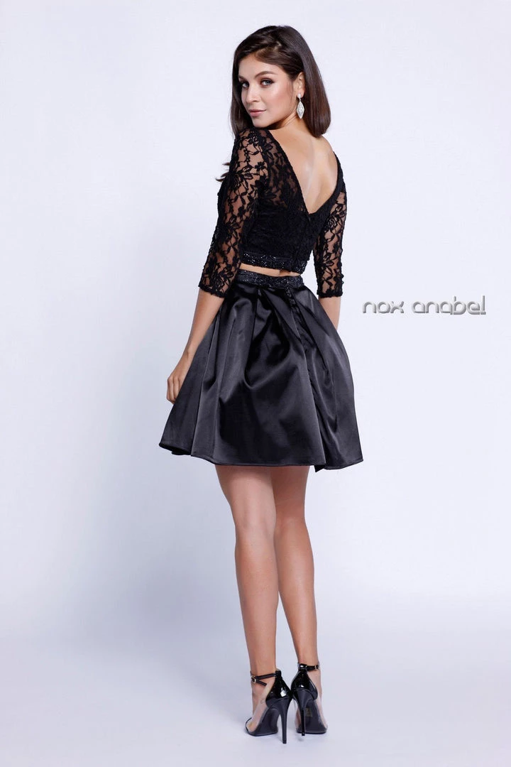 Look feminine and chic in this two-piece 3/4 sleeved lace cocktail dress by Nox Anabel Style Number 6166. This short cocktail dress features a three-quarter length sleeved lace bodice, beaded waistband, V-shaped back, short satin skirt, and a zipper closure.