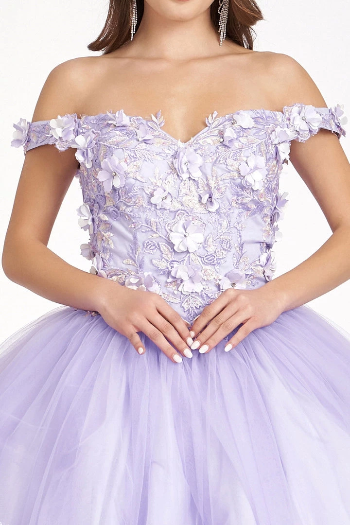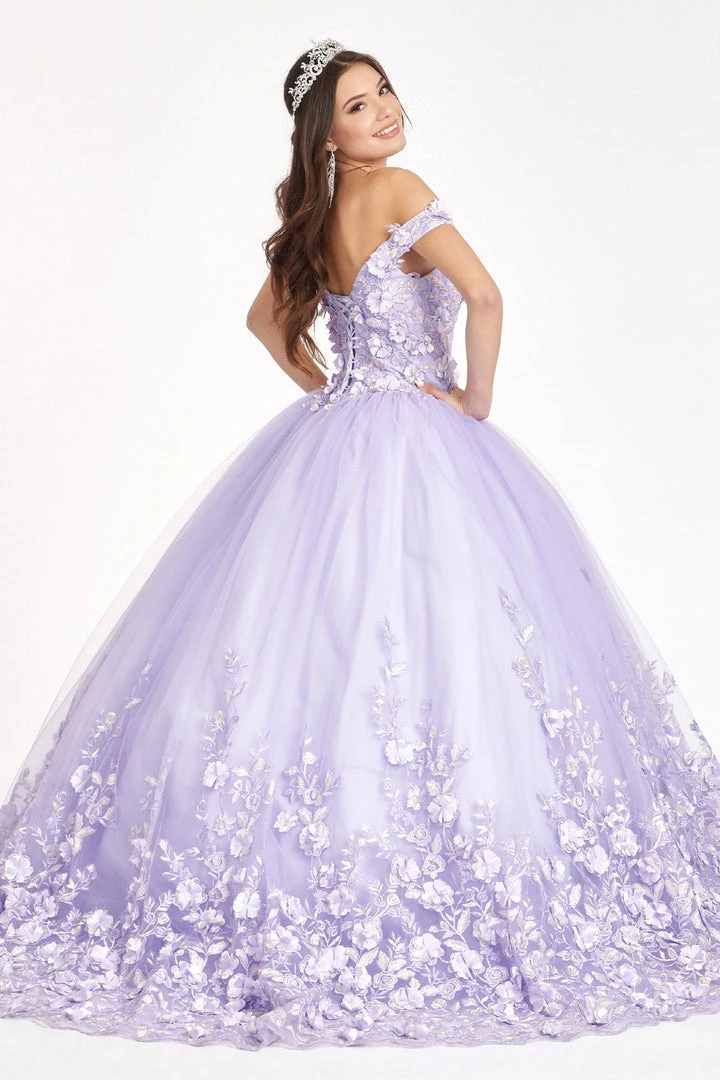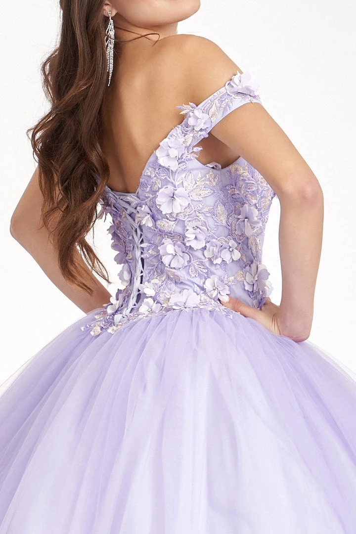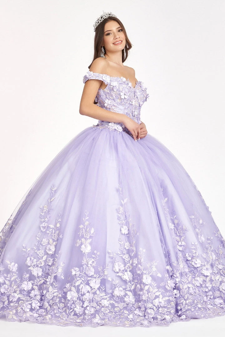 Make a grand entrance in this 3D floral embroidered long off shoulder dress with A-line skirt by Elizabeth K GL1960. This embroidered cut-away shoulder mesh Quinceanera ball gown features 3-D flower appliques. Back corset creates a waistline, and the skirt flares out into A-line dramatically.