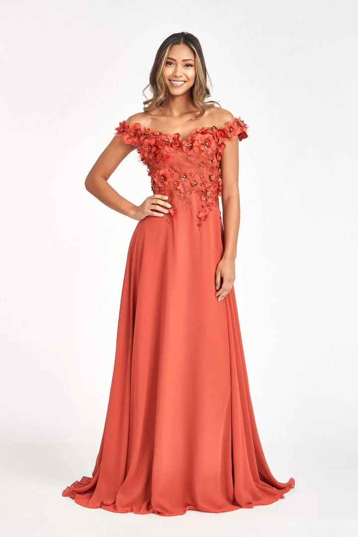 Dance the night away in this long off-shoulder dress with A-line slit skirt Elizabeth K GL3018. Off-shoulder dress with flower embellishment is utterly elegant! This beautiful chiffon A-line dress features sweetheart neckline with off-shoulder, open corset back, and side leg slit. 3-D floral appliques and delicate embroidery creates an graceful effect.