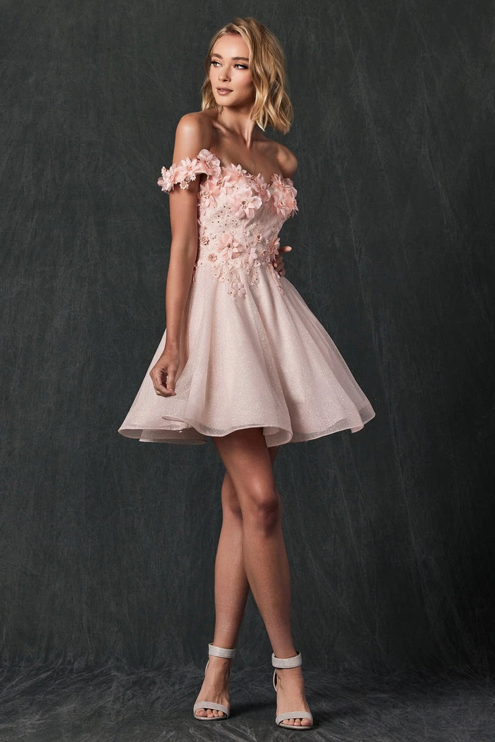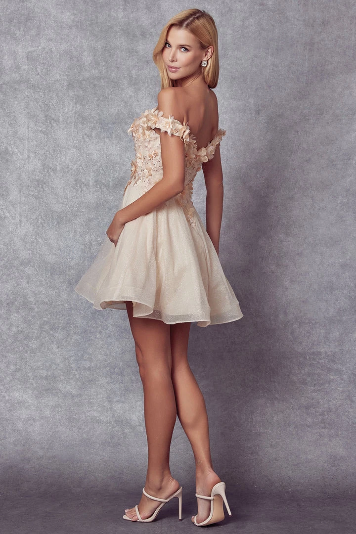 Look breathtaking in this 3D floral appliqued short off shoulder dress with A-line glitter skirt by Juliet 861.