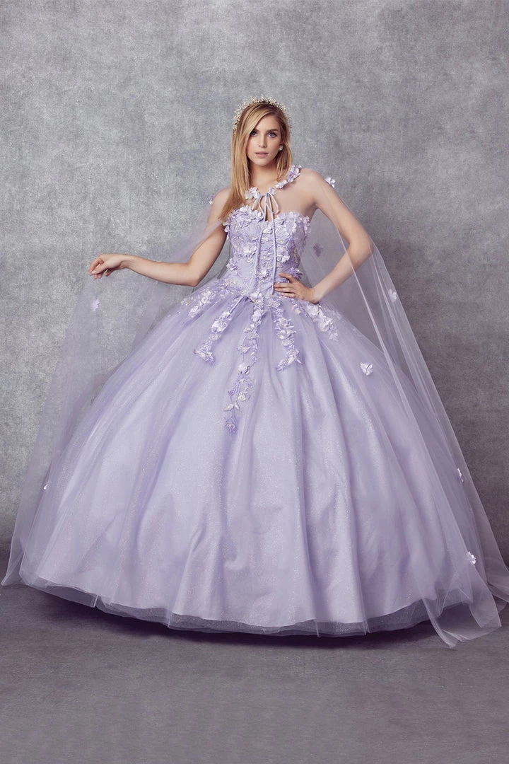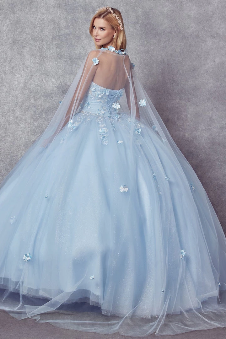 Make a grand entrance in this 3D floral applique long strapless cape dress with A-line skirt by Juliet 1435. This beautiful ballgown features a strapless sweetheart bodice, open lace-up corset back, and a full length A-line skirt that ends in a sweep train. Matching cape is included.