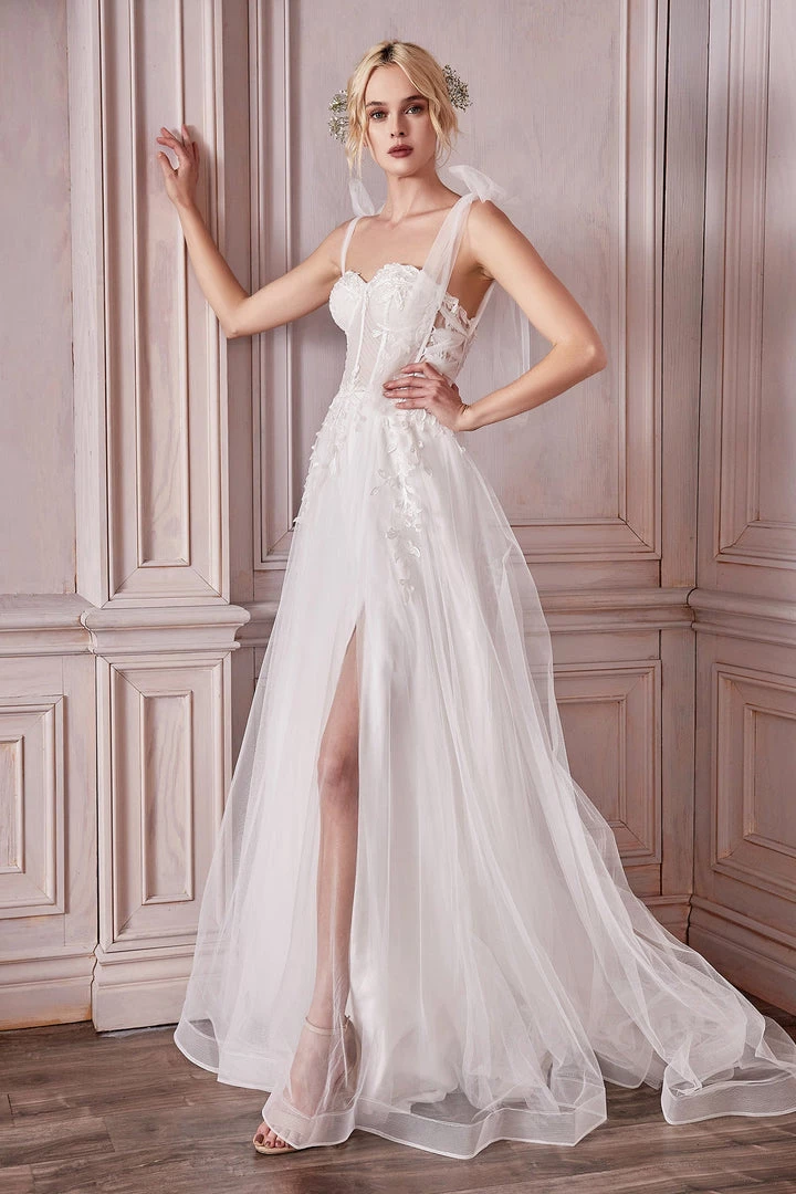 Look breathtaking in this long sleeveless corset dress with A-line skirt by Cinderella Divine CD964W. Walk down the aisle in this truly breathtaking bridal gown. Fitted in the bodice a structured corset accentuates modern bust lines. Lace appliques detail the neckline and trickle down the waist. The side seam details a sheer lace with a tulle criss cross strap shaping out to a lace up open back. An A-line silhouette flows out from the waist in layers of luxe tulle and horsehair braid hem.