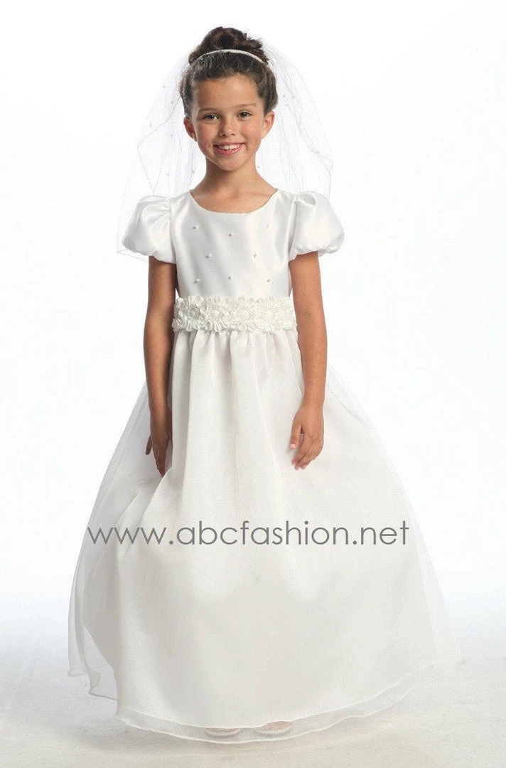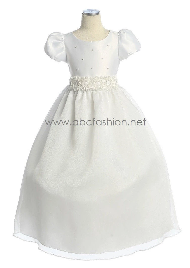 Your girl will look lovely in this beautiful white communion dress. Made out of satin and organza, this dress will light up the room with its brilliant fabric and adorable design. The bodice is speckled with beads and comes with a flower decors around the waist. Your little girl will love wearing this beautiful dress for any special occasion!