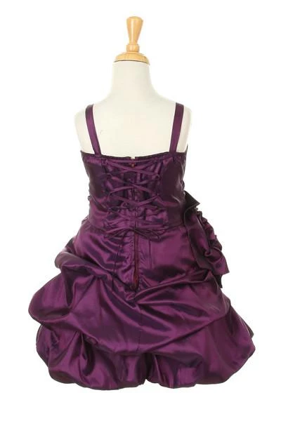 These girls short royal blue dresses are a must have for girls who want to look pretty during a wedding or any formal event. Made out of taffeta, the royal blue dress features a short pickup skirt decorated with an amazing decorative big flower on the side. The corset spaghetti back provides an excellent fit. We love that this dress also includes a matching scarf. These royal blue girls dresses are affordable and still look beautiful. Click “Add to Cart” to order this beautiful dress!