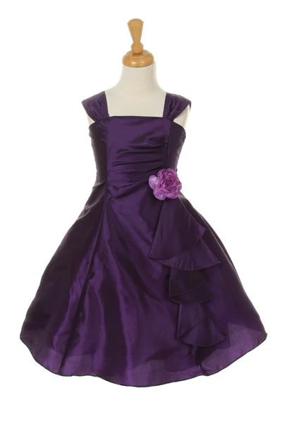 Girls Short Purple Dresses with Ruffled Skirt are a must have for girls who want to look pretty during a wedding or any formal event. Made out of taffeta, the purple dress features a long ruffled skirt decorated with an amazing decorative flower on the side. We love this knee length purple dress because it can be worn any time of the year. These fuchsia girls dresses are affordable and still look beautiful. Click “Add to Cart” to order this beautiful dress!