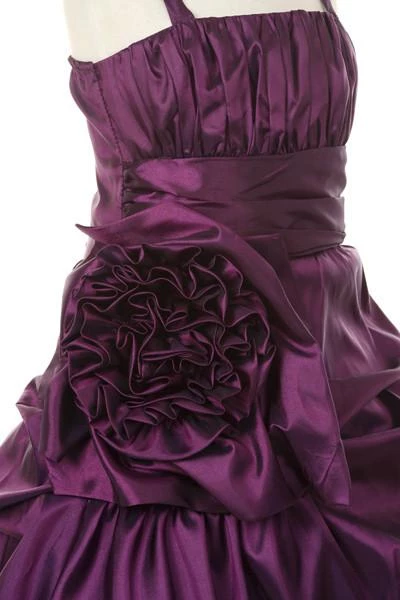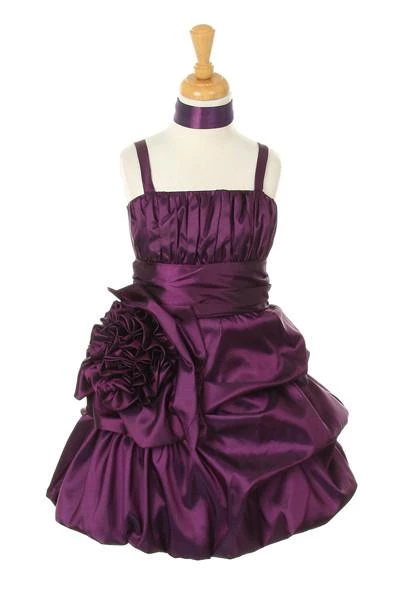 These girls short purple dresses are a must have for girls who want to look pretty during a wedding or any formal event. Made out of taffeta, the purple dress features a short pickup skirt decorated with an amazing decorative big flower on the side. The corset spaghetti back provides an excellent fit. We love that this dress also includes a matching scarf. These purple girls dresses are affordable and still look beautiful. Click “Add to Cart” to order this beautiful dress!