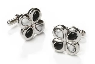 Add a classy look to your outfit with these clover shaped silver cufflinks decorated with black and white stones. A variety of cufflinks make a great addition to any wardrobe because they add a sophisticated finishing touch to a formal attire. Look sharp in these affordable cuff links for job interviews, weddings, work, for any occasion. Also make a great gift for men!