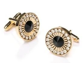 Add a refined look to your outfit with these round gold cufflinks decorated with a black gem and clear crystals. A variety of cufflinks make a great addition to any wardrobe because they add a sophisticated finishing touch to a formal attire. Look sharp in these affordable cuff links for job interviews, weddings, work, for any occasion. Also make a great gift for men!