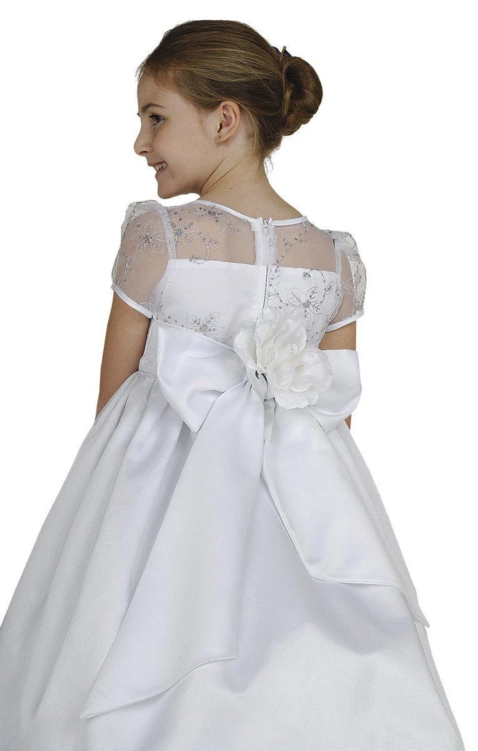 These $55 white flower girl dresses are a must have for girls who want to look pretty during a wedding, communion, or any formal occasion. The organza overlay on satin piping dress features amazing sequined embroidery that will make these gowns stand out in the room. The tea length skirt will gracefully glide as your little girl moves. These flower girl dresses are great for weddings, communions, formal parties, or any special event. For $55, these flower girl dresses are affordable and still look beautiful. Click “Add to Cart” to order this gorgeous dress!