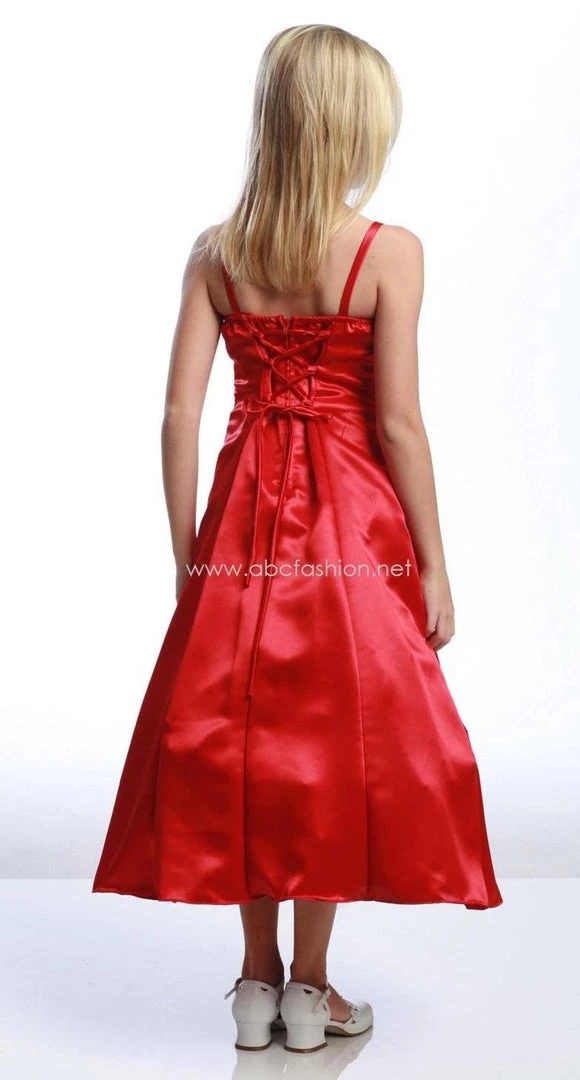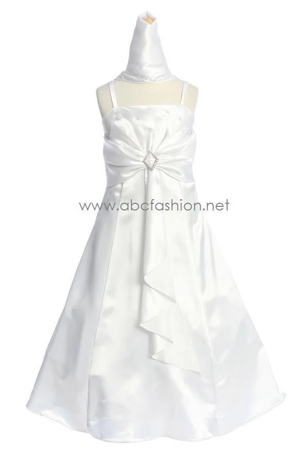 Your girl will look lovely standing next you in this A-line junior bridesmaid dress. Made out of shiny satin, this dress will light up the room with its brilliant fabric. The bodice has fabric gathered in the center and a ruffle that gracefully falls in the middle. The solid bodice is contrasted with beads and a rhinestone buckle. This dress comes with a matching shawl. Falls to the ankles and zips/ties up in the back. Available in many versatile colors to fit your theme. Dress your girl in this beautiful dress for a wedding or any special occasion!