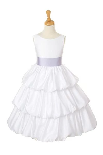 These white flower girl dresses are a must have for girls who want to look pretty during a wedding. Made out of satin, the white dress features a sleeveless bodice and a pickup skirt. These flower girl dresses are versatile because they are available in many colors and allows you to choose the sash and flower color to fit your theme anytime of the year. The layered tea length skirt will gracefully glide as your little girl moves. These flower girl dresses are great for weddings, communions, formal parties, or any special event. These flower girl dresses are affordable and still look beautiful. Click “Add to Cart” to order this gorgeous dress!