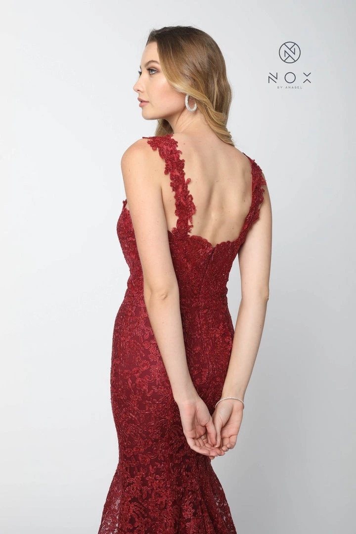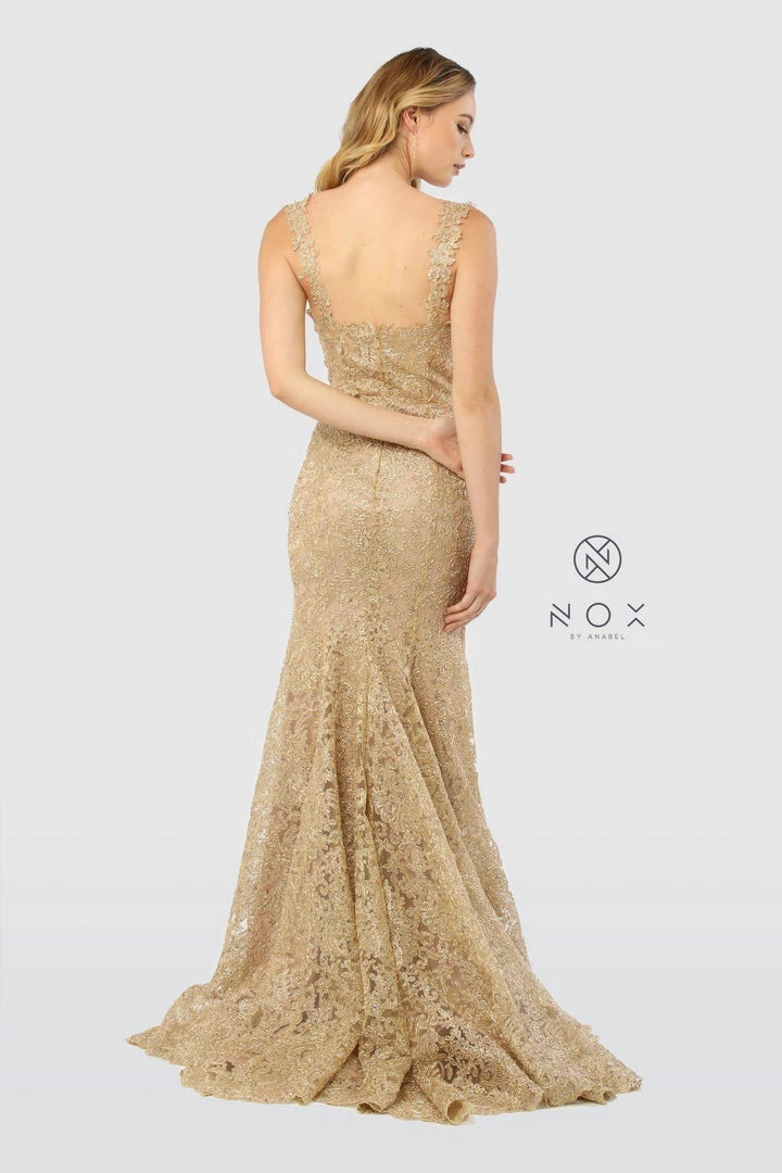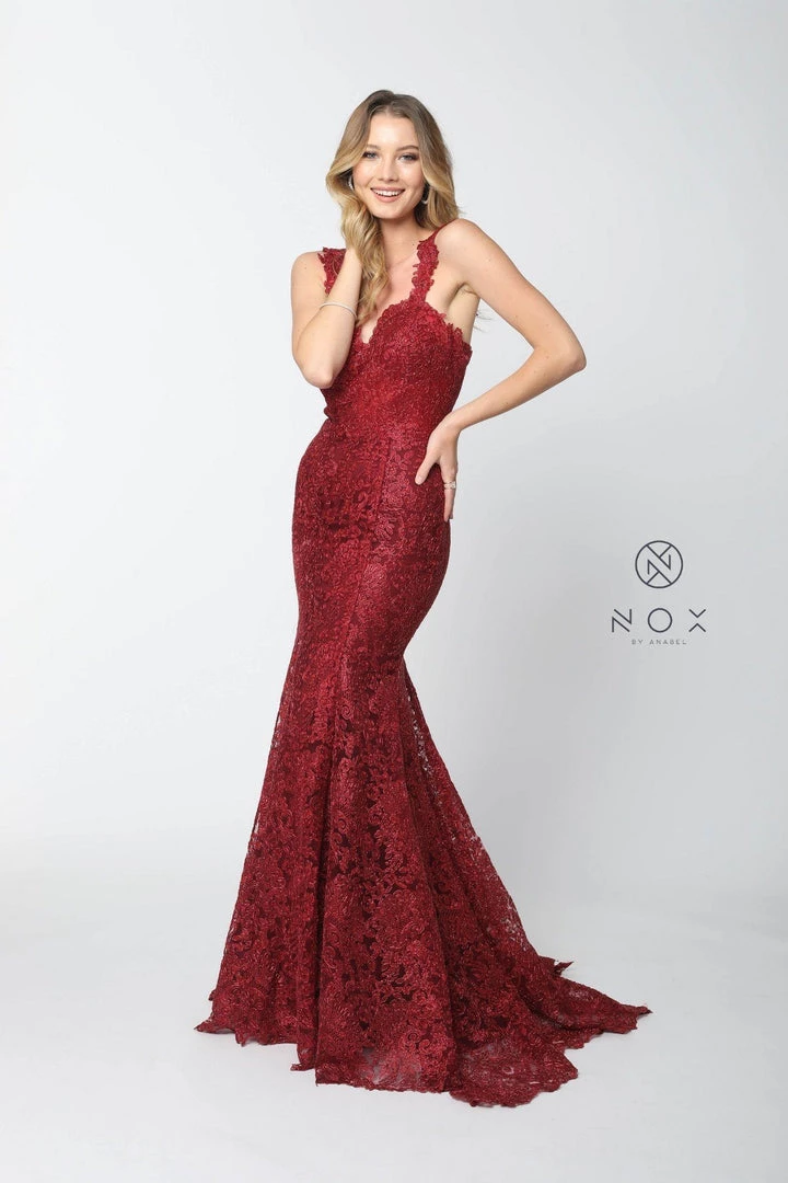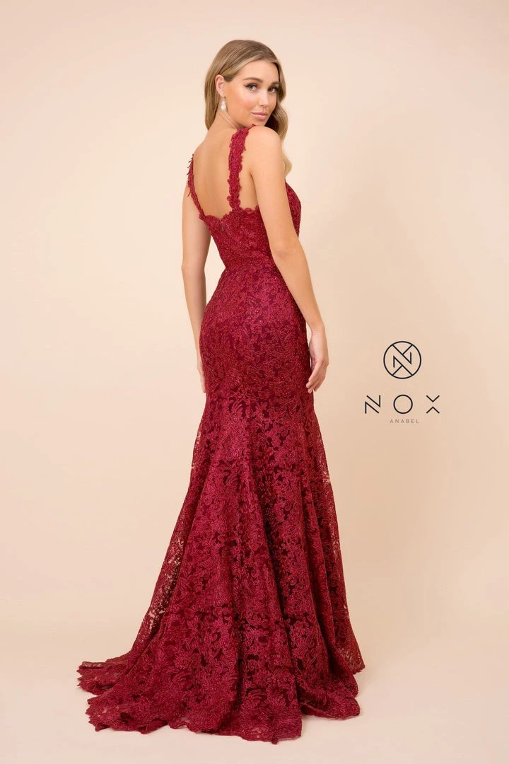 Receive lots of compliments in this long sleeveless lace mermaid dress by Nox Anabel R216.