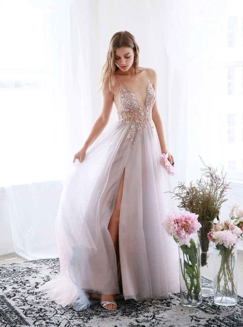 Light up the room in this bead embellished long V-neck dress with A-line tulle skirt by Andrea & Leo A0672. Floral beading falls flatteringly in sexy V-front and flares weightlessly at the tulle skirt with a leg slit.