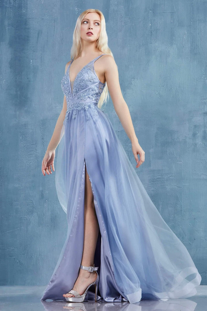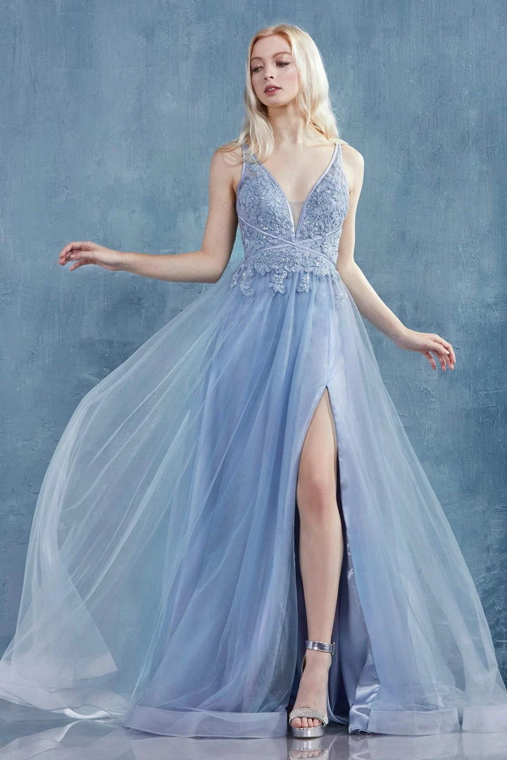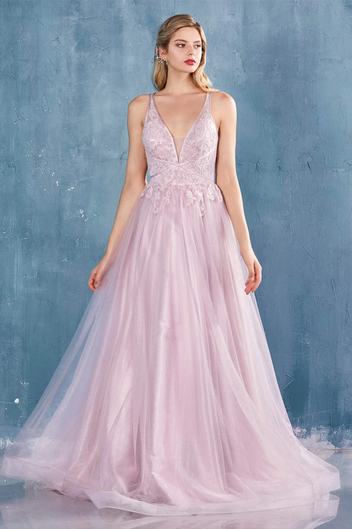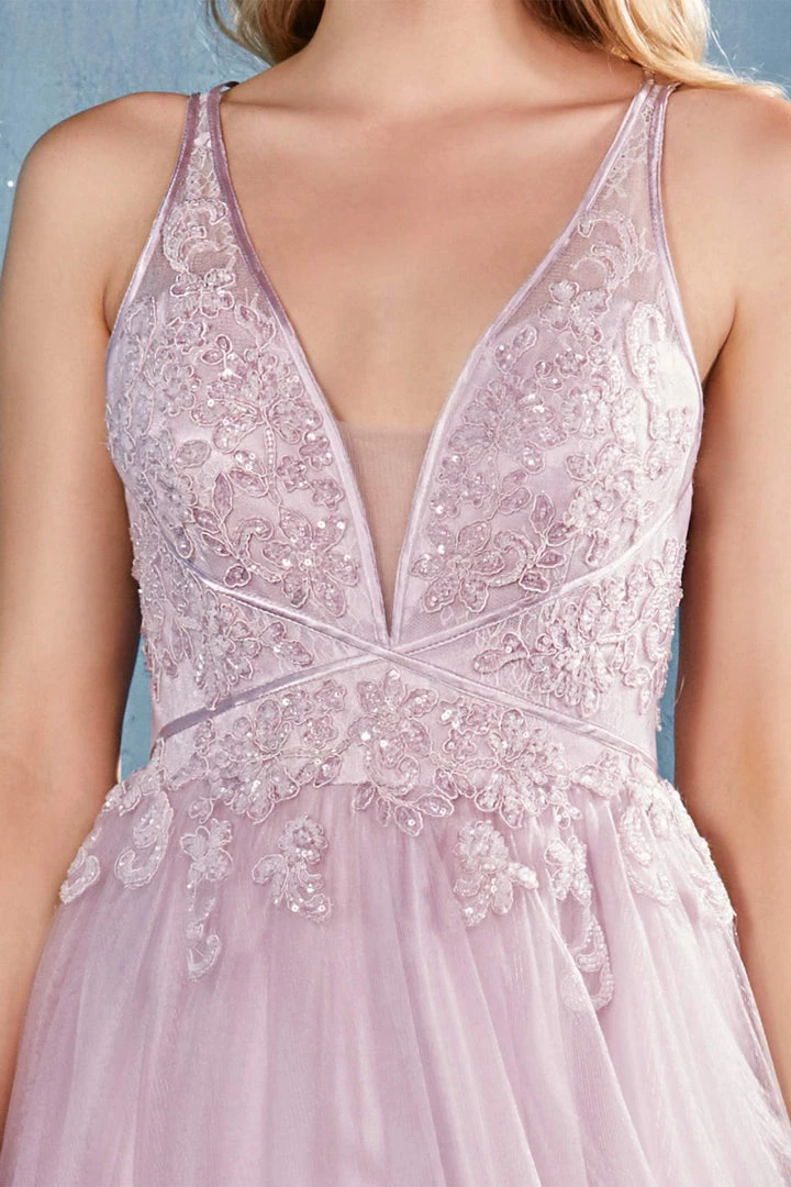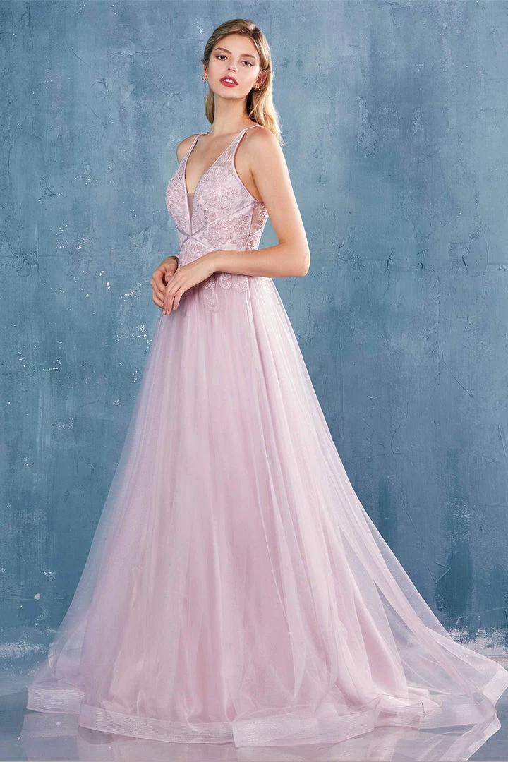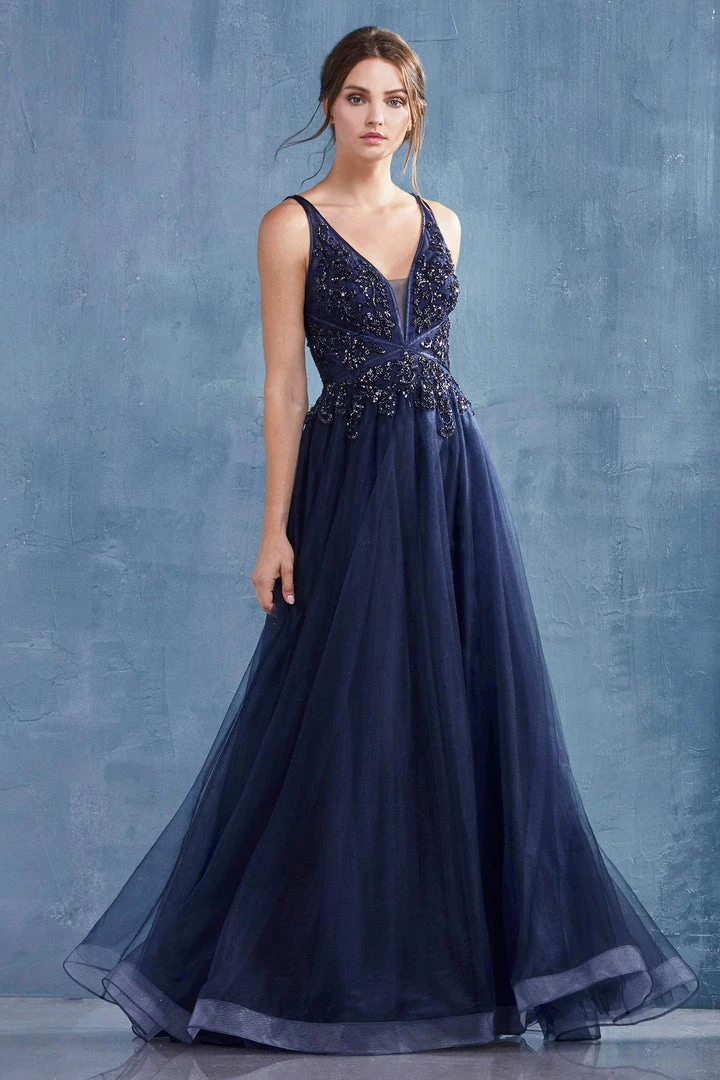 Look picture-perfect in this floral beaded long V-neck tulle dress with A-line skirt by Andrea & Leo A0762.