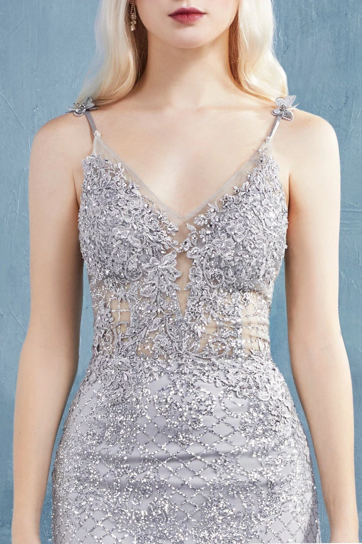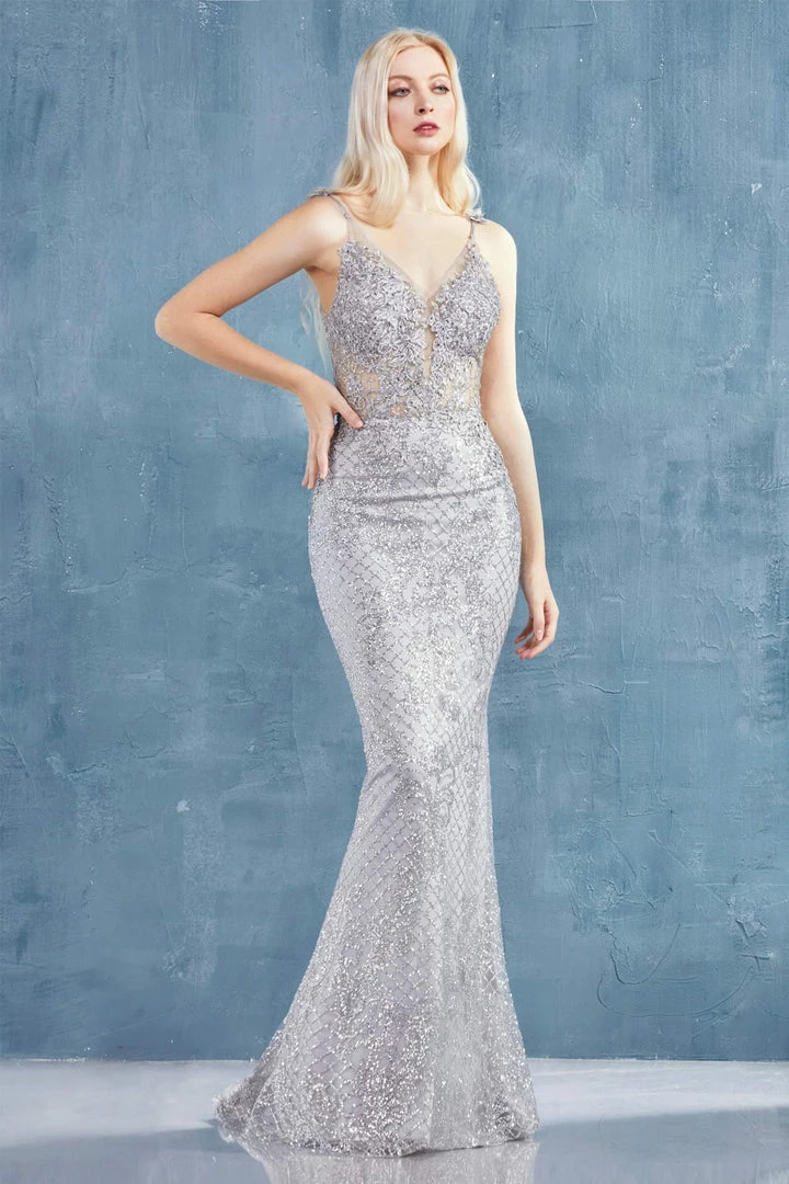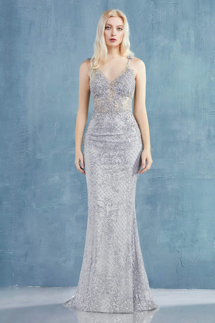 Be red carpet ready in this lace applique long fitted glitter dress by Andrea & Leo A0960.