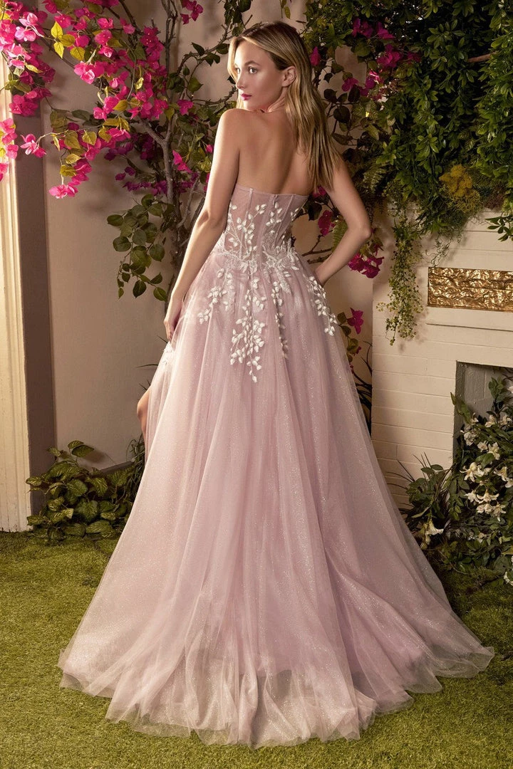 Command attention in this floral applique long strapless dress with A-line skirt by Andrea & Leo A1029.