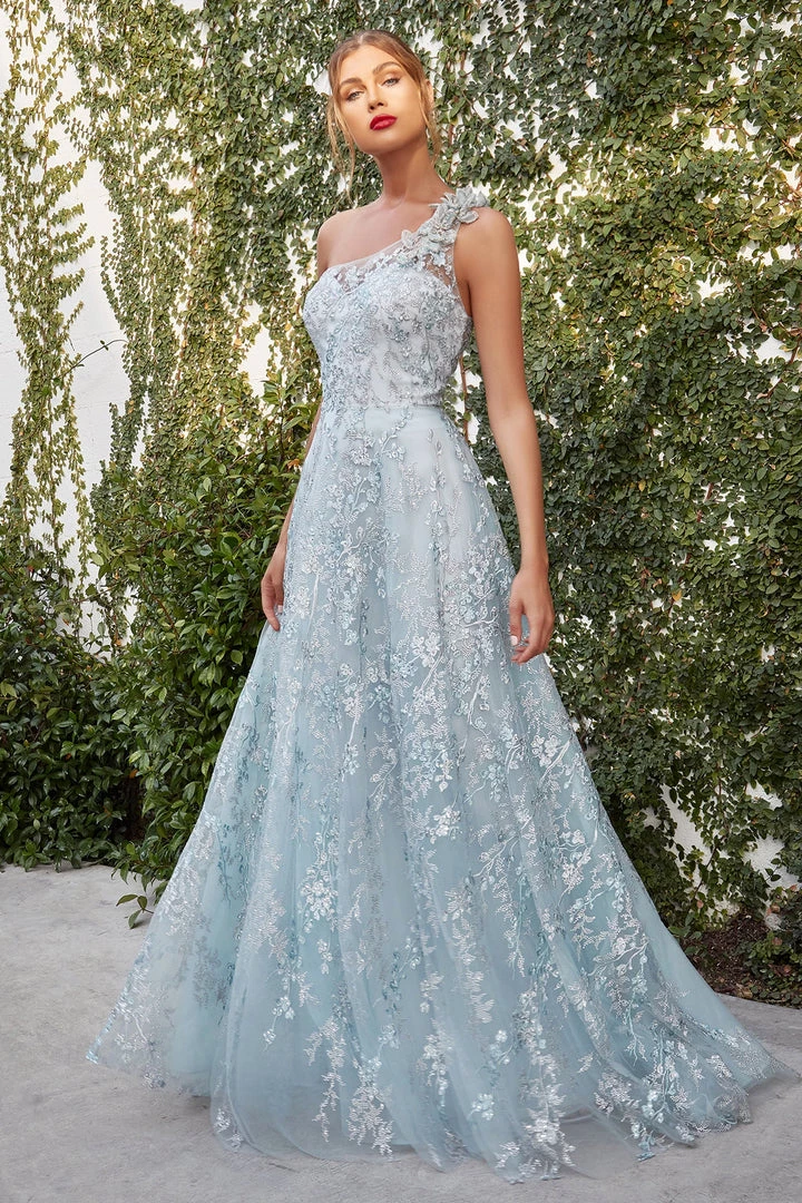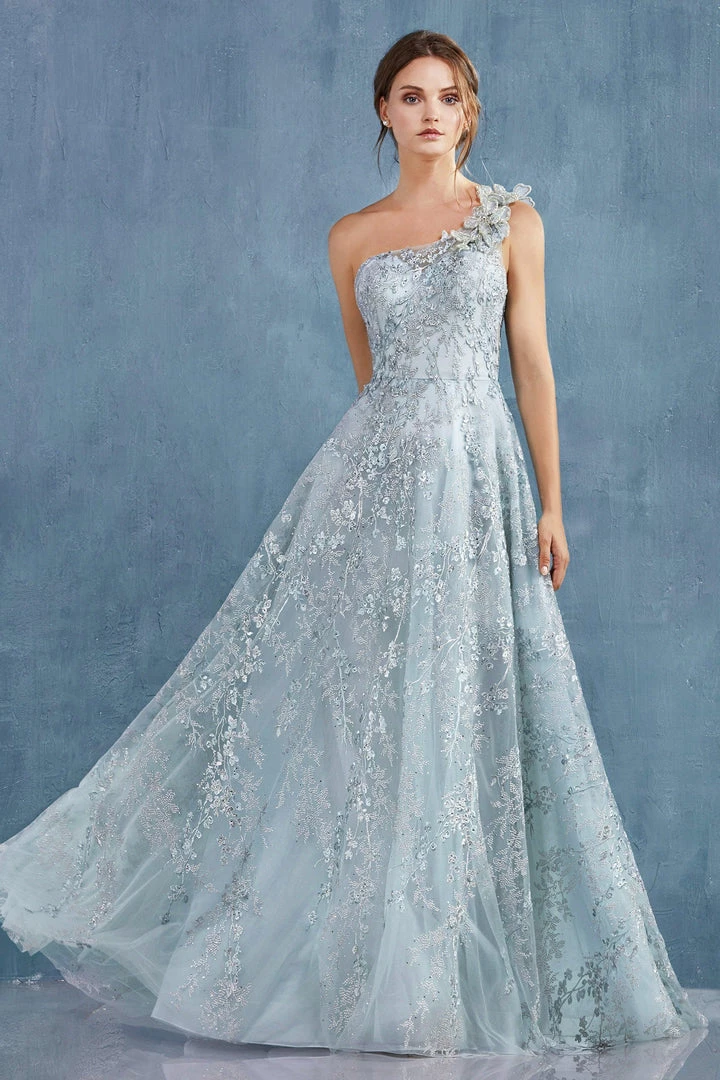 Show off your fashion sense in this floral applique long one shoulder dress with A-line tulle skirt by Andrea & Leo A0989.