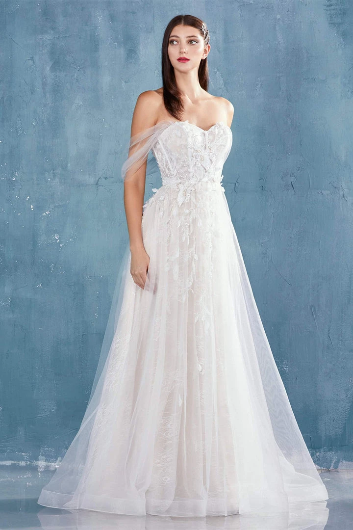 Make a grand entrance in this bird embellished long off the shoulder dress with A-line tulle skirt by Andrea & Leo A0822.