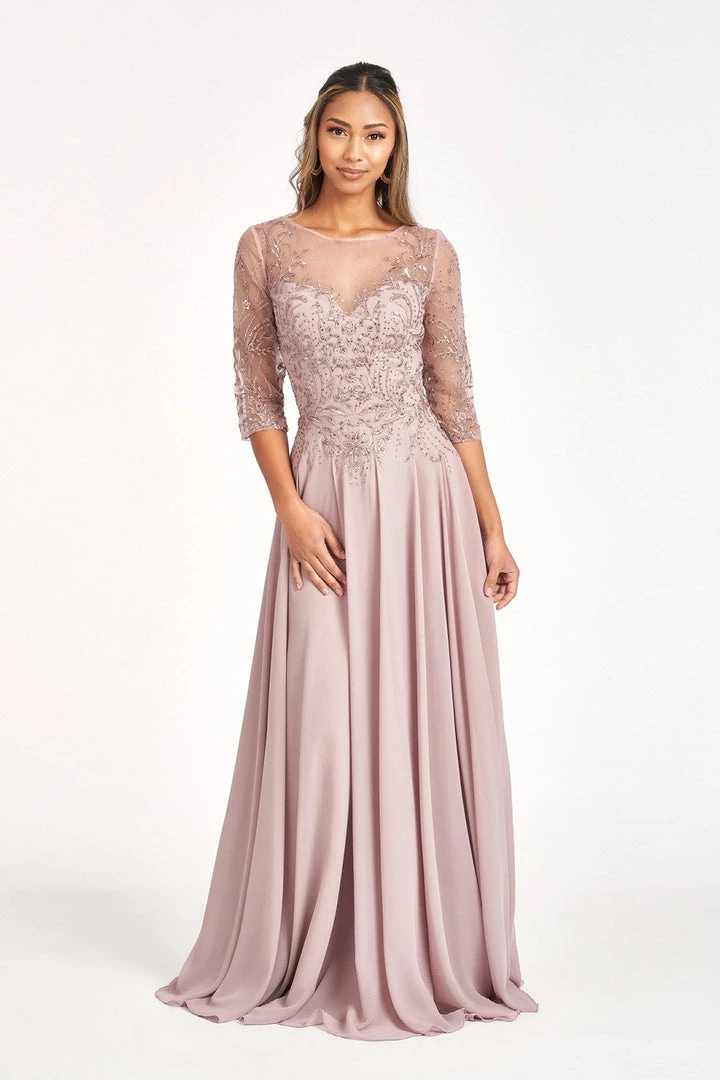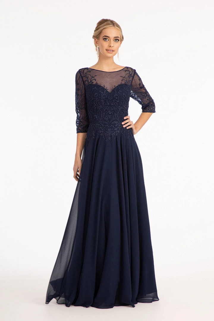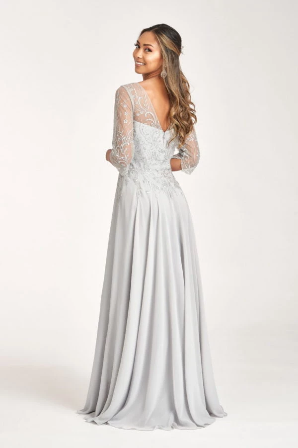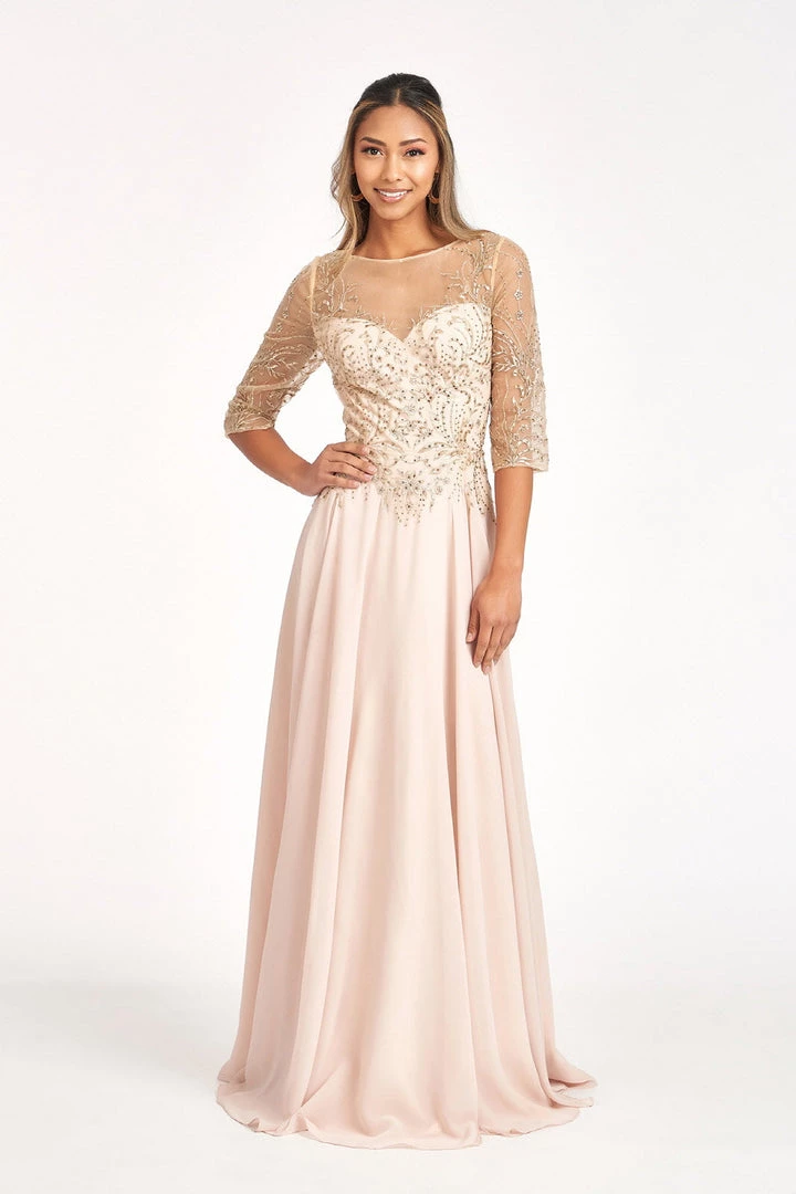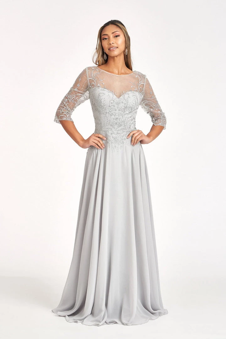You’ll love dancing in this long chiffon illusion sweetheart dress with A-line skirt Elizabeth K GL3066. This chiffon A-line dress is decorated with delicate embroidery and beautiful beads. 3/4 sheer sleeves create a elegant effect, and open V-back add chic look.