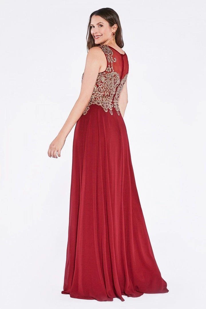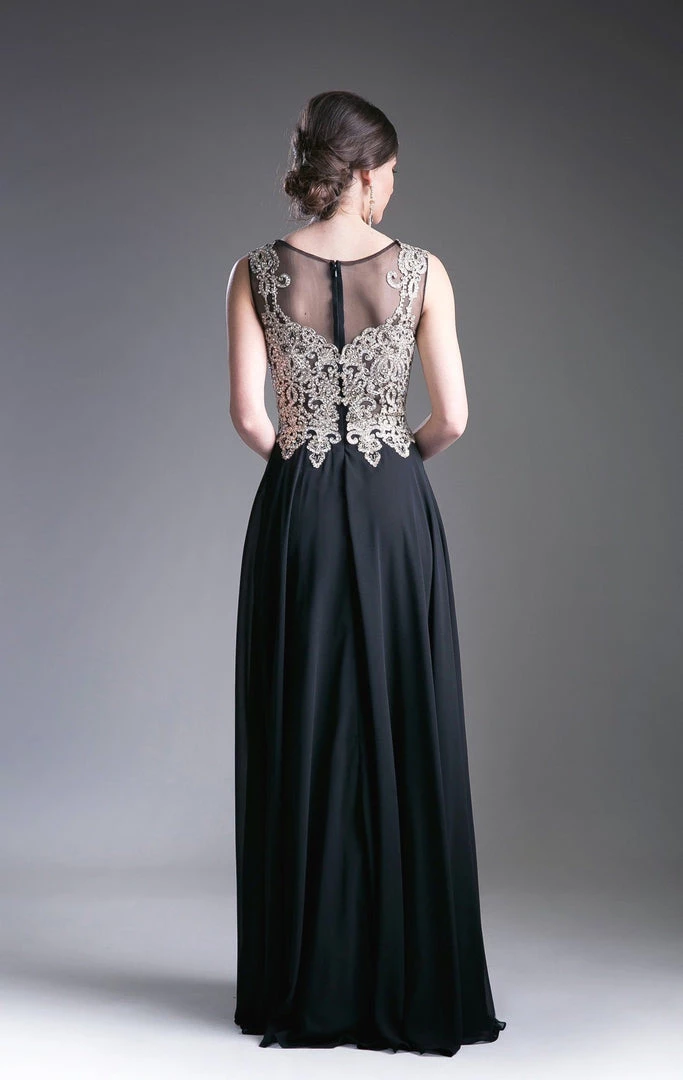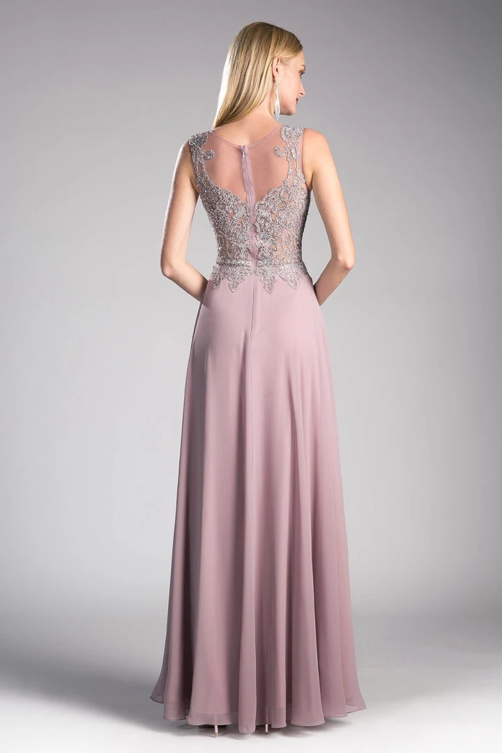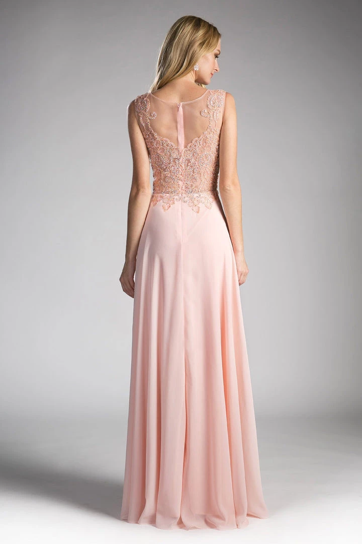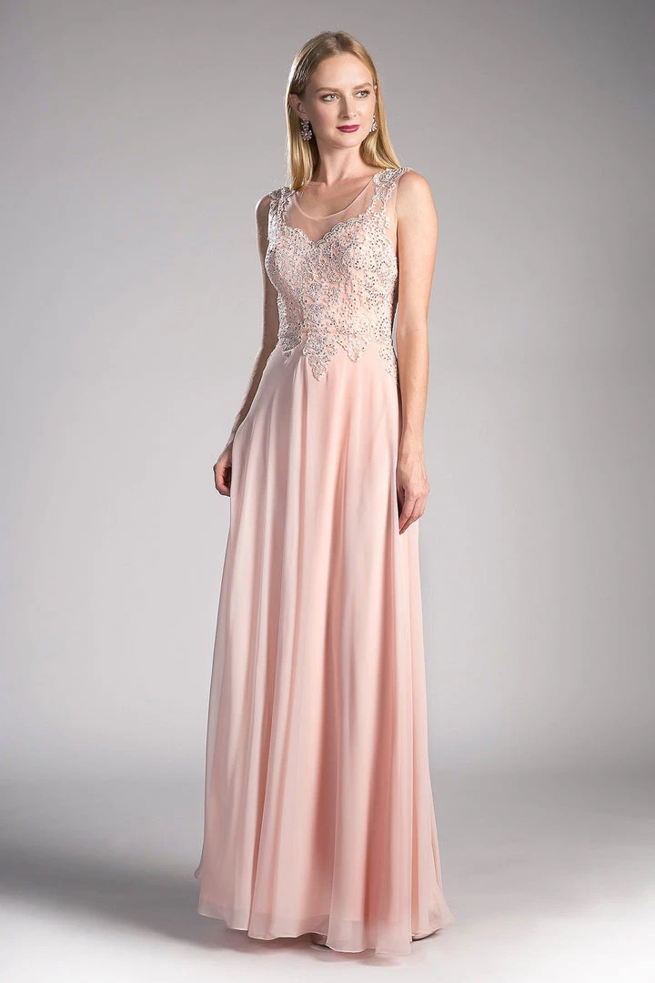 Fall in love with this long illusion dress with beaded embroidery by Cinderella Divine 2635. This chiffon evening gown features a sheer sweetheart scoop bodice adorned with beautiful jeweled lace appliques, enclosed illusion back, floor length A-line skirt, and a zipper closure.