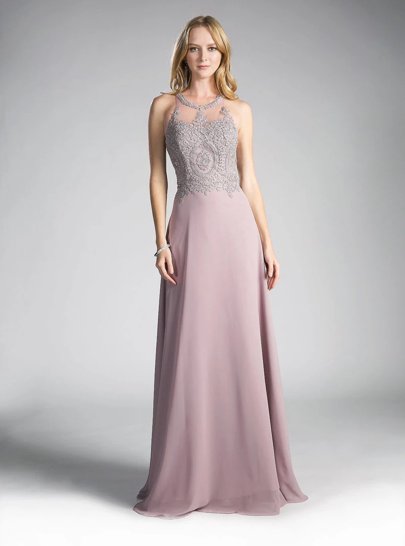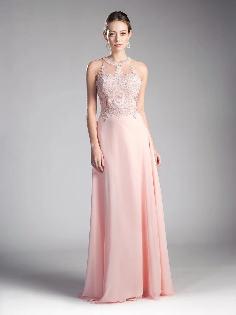 Light up the room in this long high-neck sleeveless formal dress with illusion appliqued bodice by Cinderella Divine UJ0120. This evening gown features a sleeveless illusion bodice adorned with lace appliques accented with beads that flows down to the natural waistline, embellished strappy open back, floor length chiffon A-line skirt, and a zipper closure.