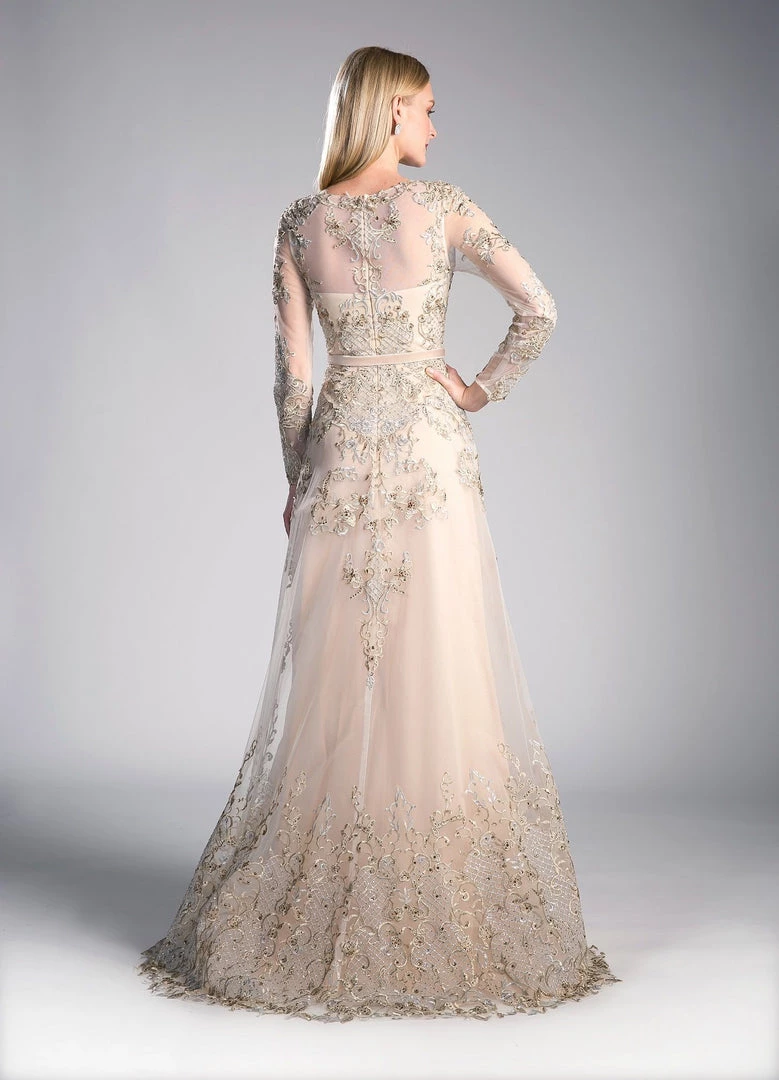 Look modest chic in this long embroidered dress with sheer sleeves by Cinderella Divine 7196. This evening gown features a beautiful illusion sweetheart neckline adorned with beaded appliques, sheer long sleeves, enclosed beaded back, belt defines the waist, a floor length embellished A-line skirt, and a zipper closure.