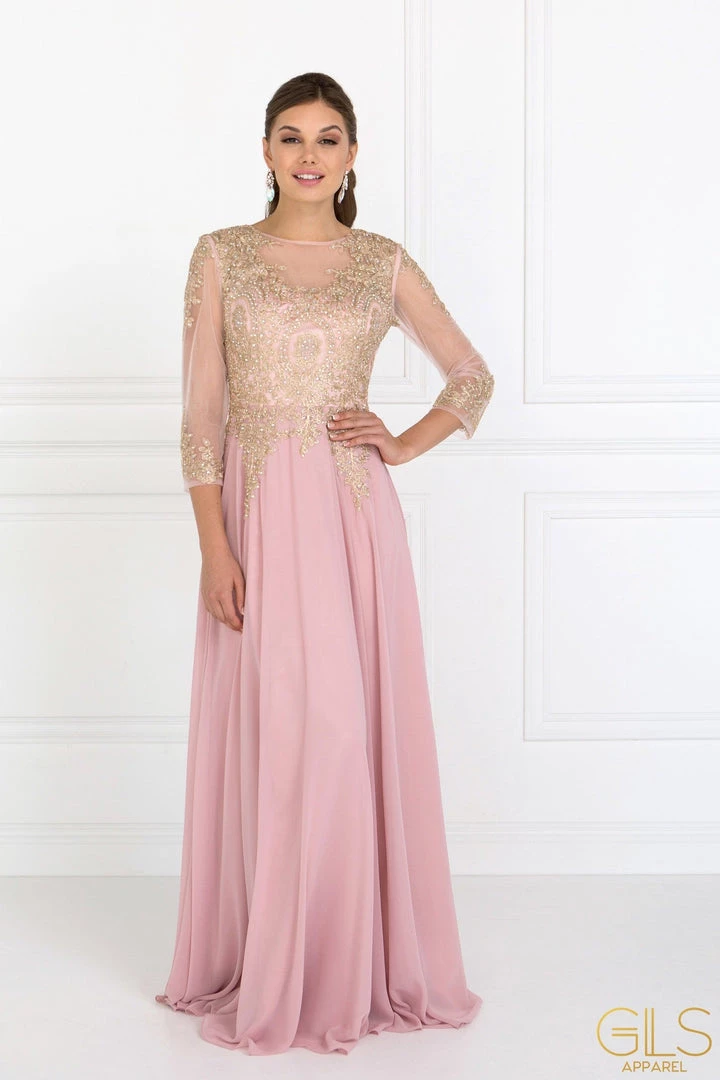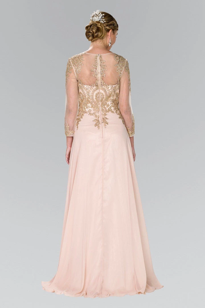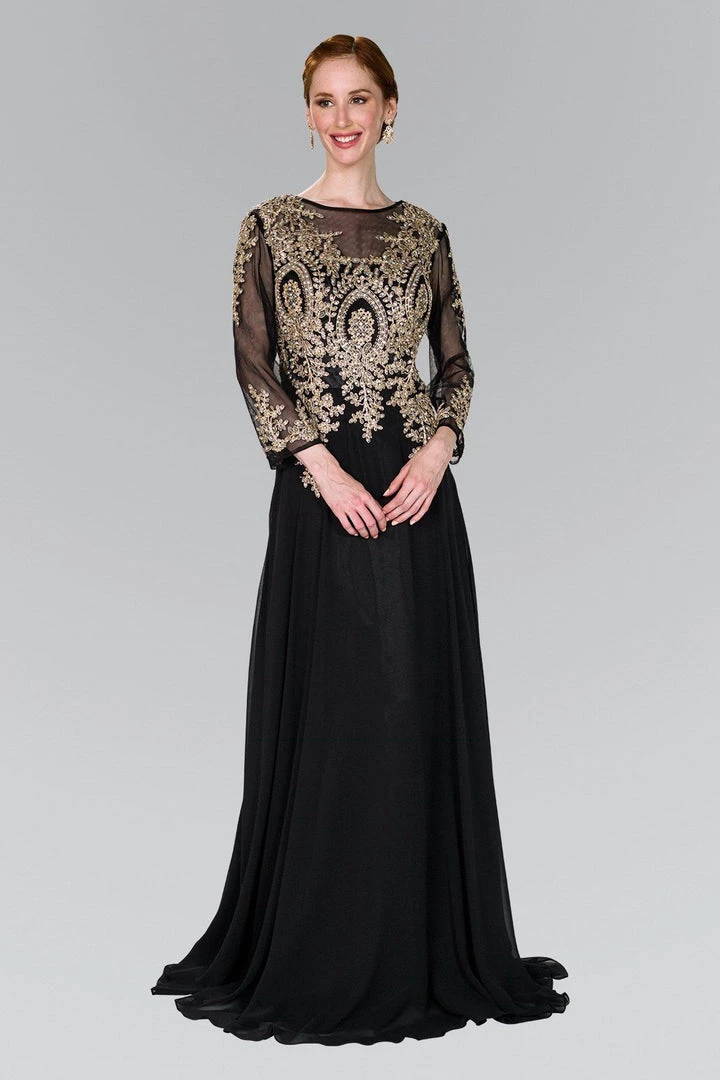 Look chic yet modest in this long sleeve dress with lace appliques by Elizabeth K GL1368. Long sleeve lace embellished dress with a boat neckline on a trumpet silhouette. Has full bold embroidery work on front and back. Sheer panel back with zipper close.