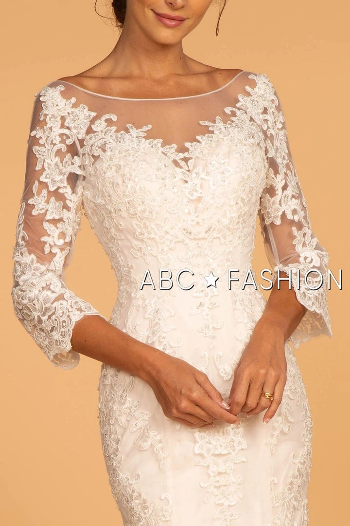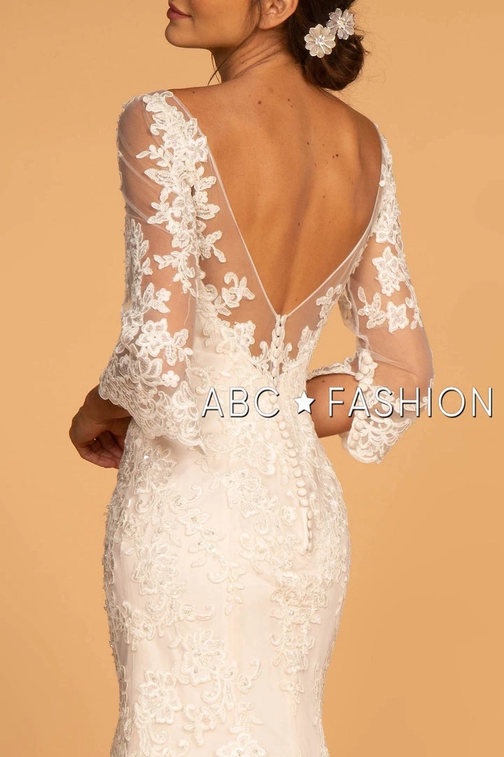 Look unforgettable in this lace appliqued long sleeve dress with mermaid skirt by Elizabeth K GL2592 during your wedding or for any formal event. This beautiful long-sleeve gown features a sheer sweetheart neckline adorned with elegant embroidered floral appliques accented with dainty beads, embellished open V-back, the floor length mermaid skirt is completed with a sweep train, and a cover button closure.