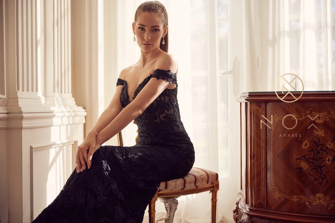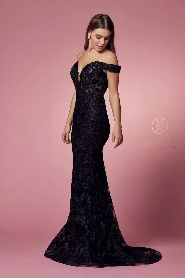Look timeless in this floral applique off the shoulder mermaid dress by Nox Anabel C439. Beautiful floral appliquƩs covers each curve as it flows throughout the silhouette while the slightly curved V-neckline flows into a sheer off-the-shoulder lace detail.