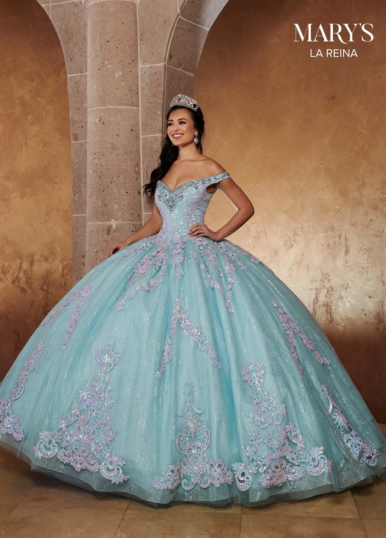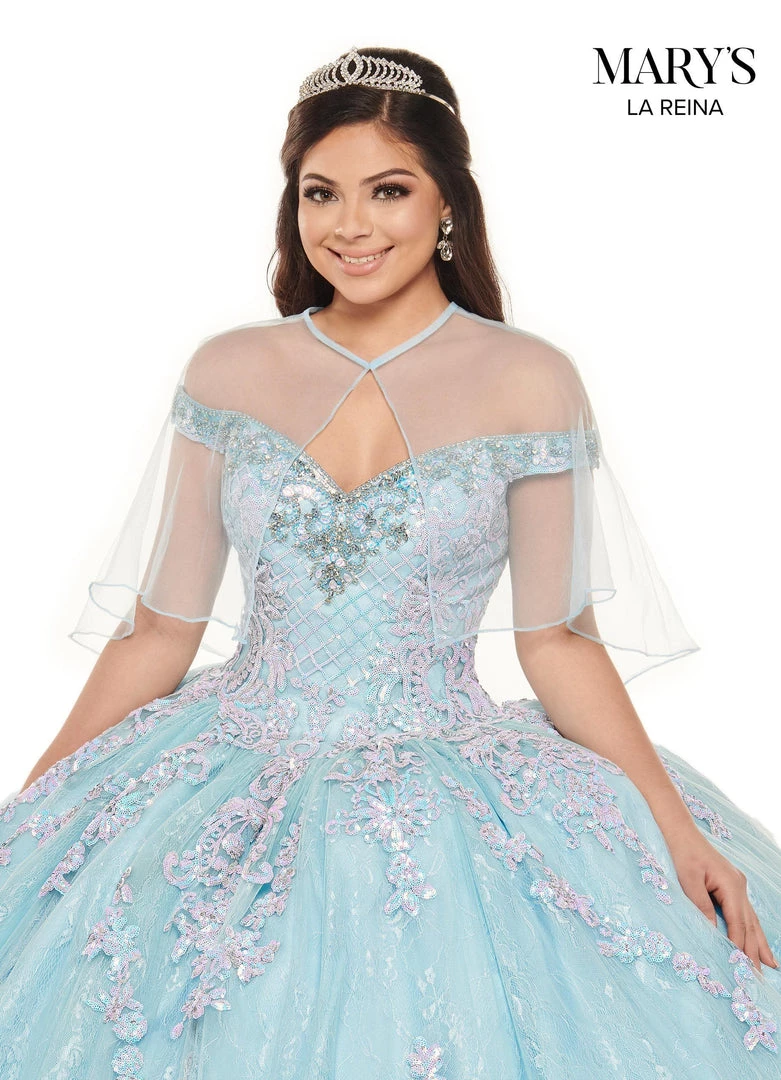 Be a trendsetter in thisĀ appliqued long off the shoulder dress with A-line skirt by Mary’s Bridal Quinceanera MQ2119. Off the shoulder lace and tulle ball gown with a glittering beading around the V-neckline and iridescent floral applique cascading down the skirt and around the hem. The gown finishes with a corset back and a sweep train. The matching cape is included.