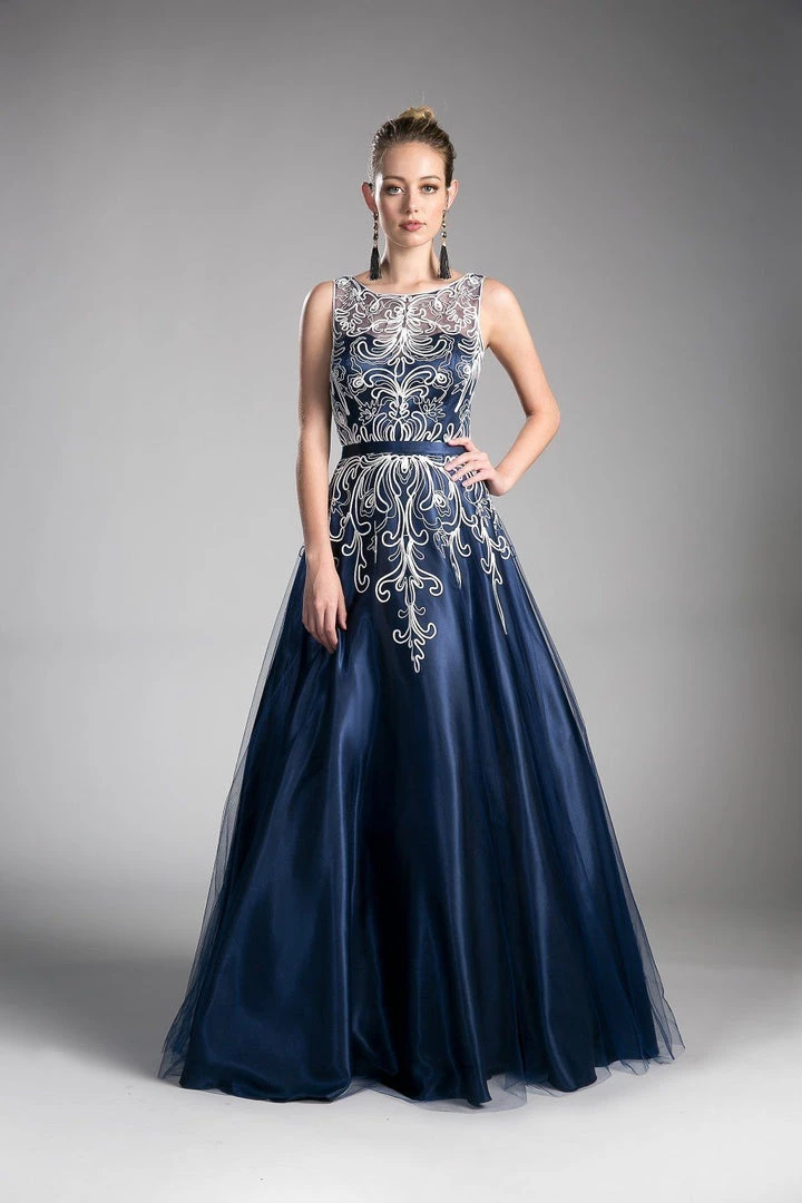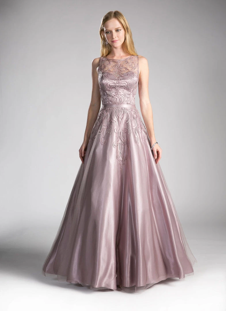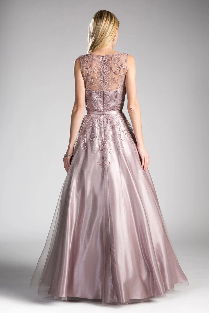 Look modest chic in this long sleeveless dress with illusion embroidered bodice by Cinderella Divine 1020. This evening gown features a sleeveless illusion bodice adorned with beautiful embroidery, satin belt defines the waistline, embellished sheer back, floor length A-line skirt, and a zipper closure.