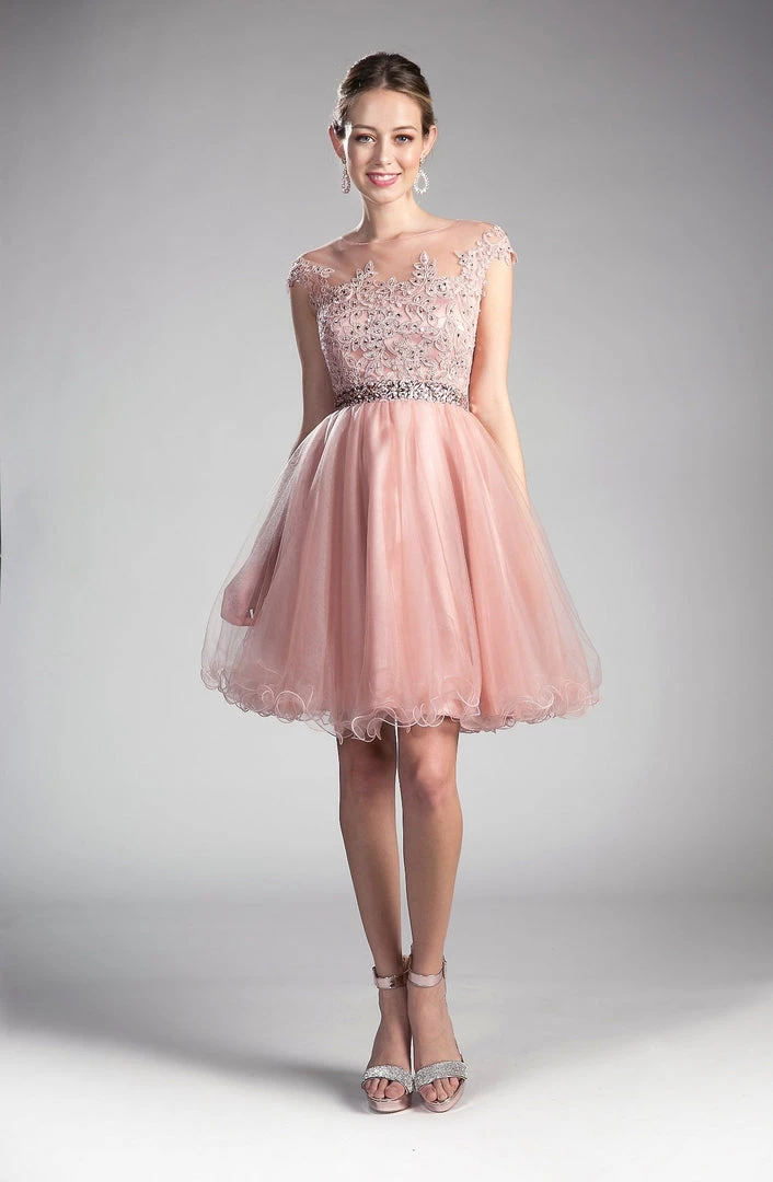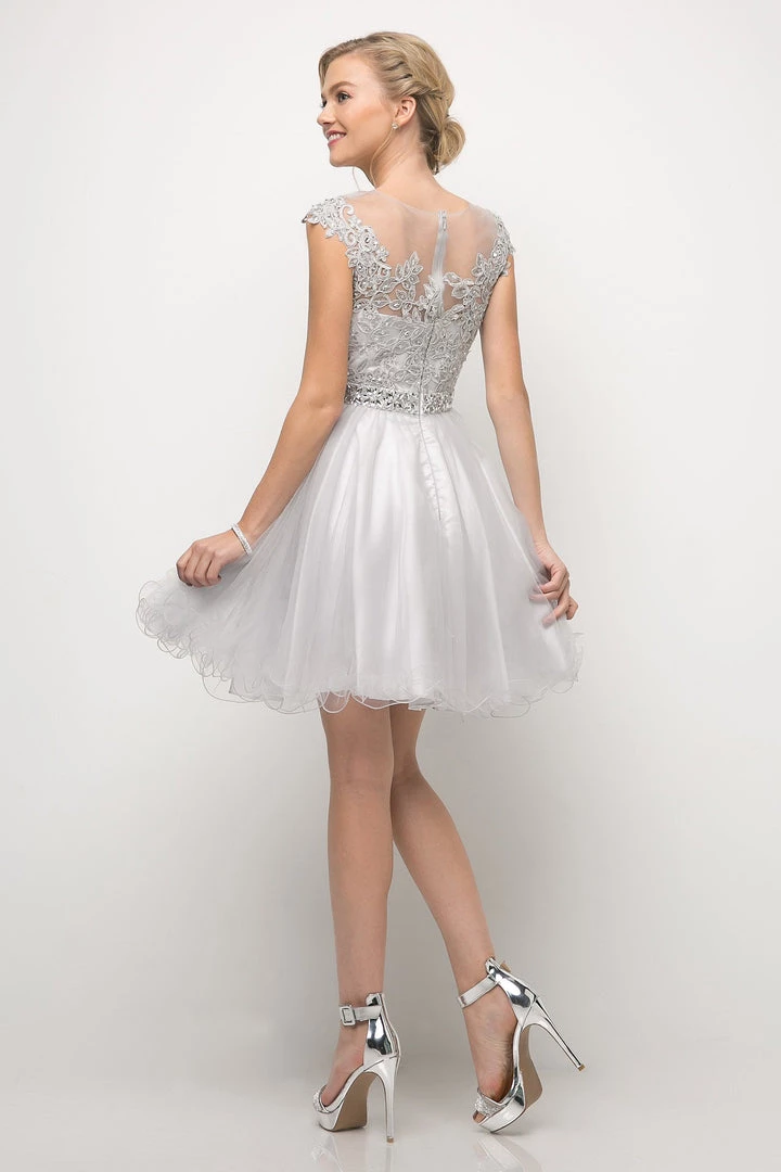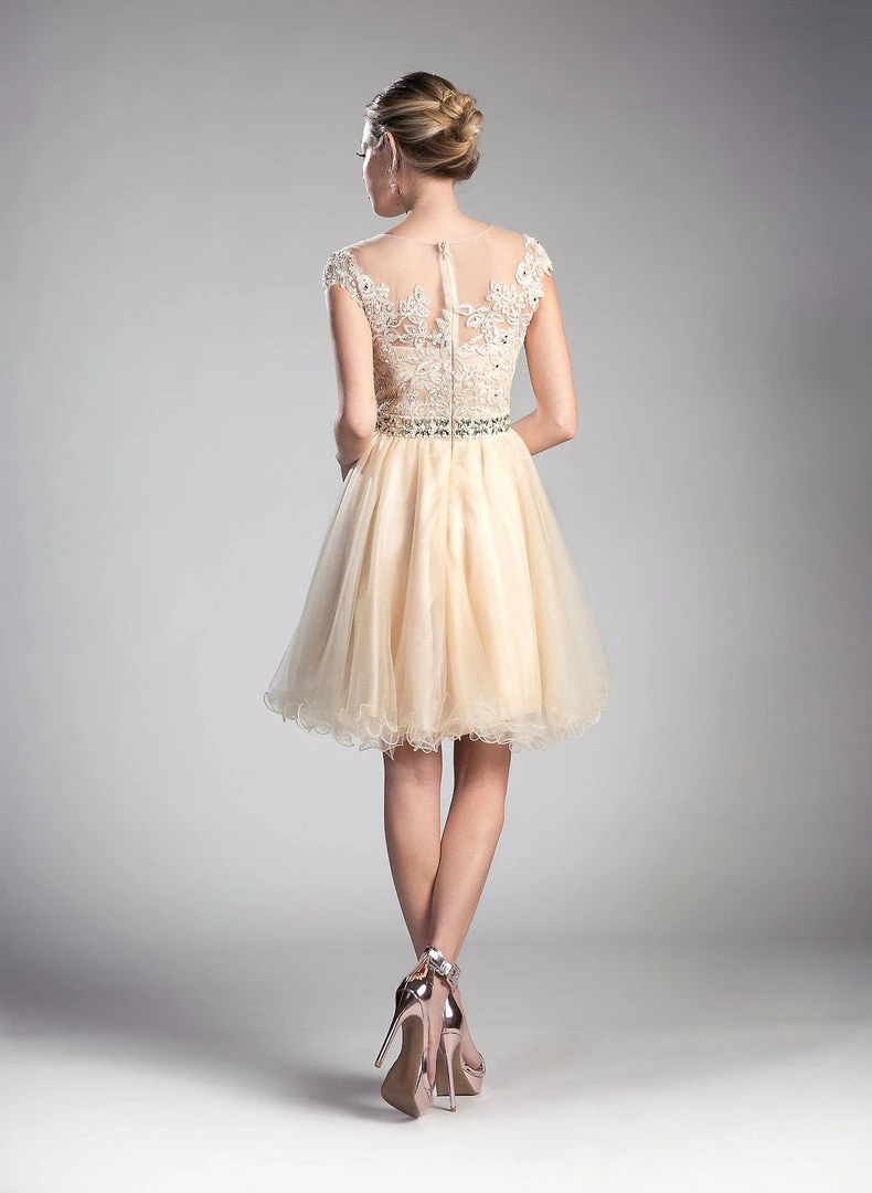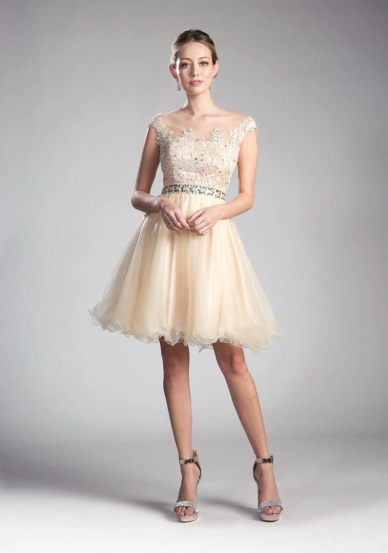 Dance the night away in this short ruffled dress with embroidered cap-sleeve bodice by Cinderella Divine UJ0012. This cocktail dress features a cap sleeve illusion bodice with gorgeous embroidery accented with beads, beaded waistline, embellished sheer enclosed back, a short hem rolled tulle skirt, and a zipper back.