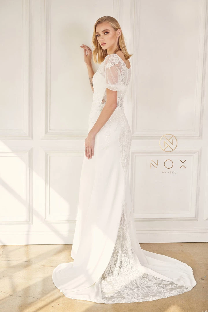 - Applique Fitted Short Sleeve Wedding Gown by Nox Anabel JE927