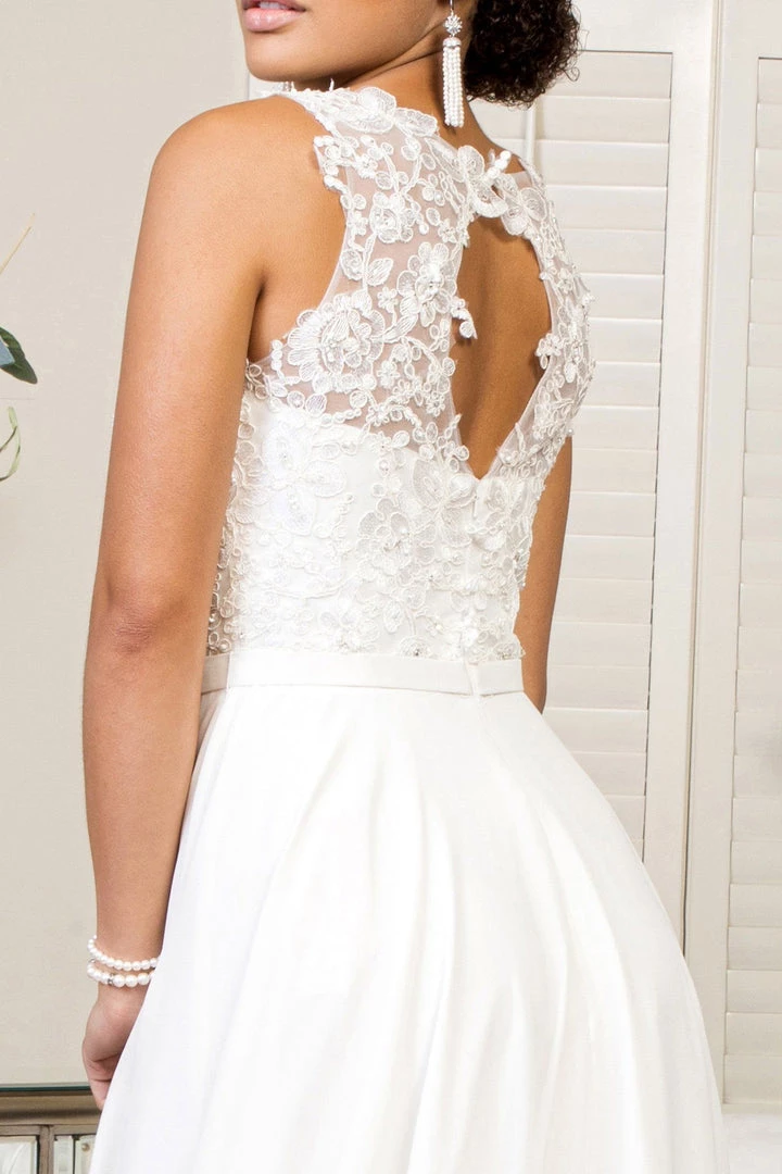 Make lasting memories in this long lace applique dress with A-line chiffon skirt by Elizabeth K GL1952.