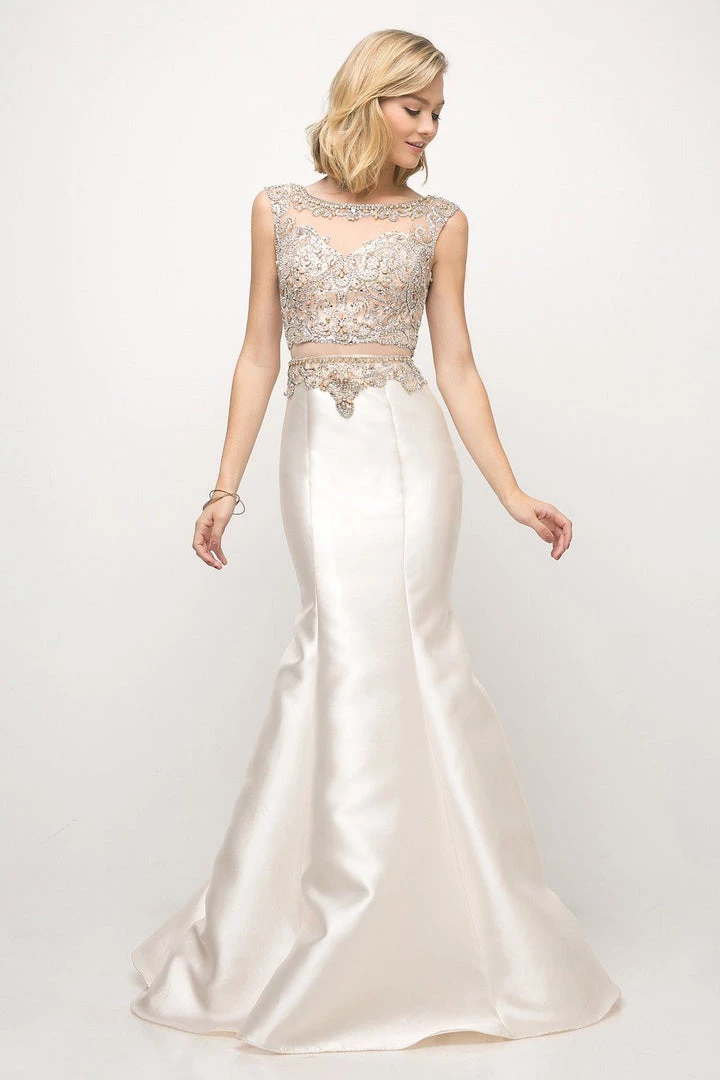 Dance the night away in this bead embellished long mock two-piece dress with fitted mermaid skirt by Cinderella Divine 8990.