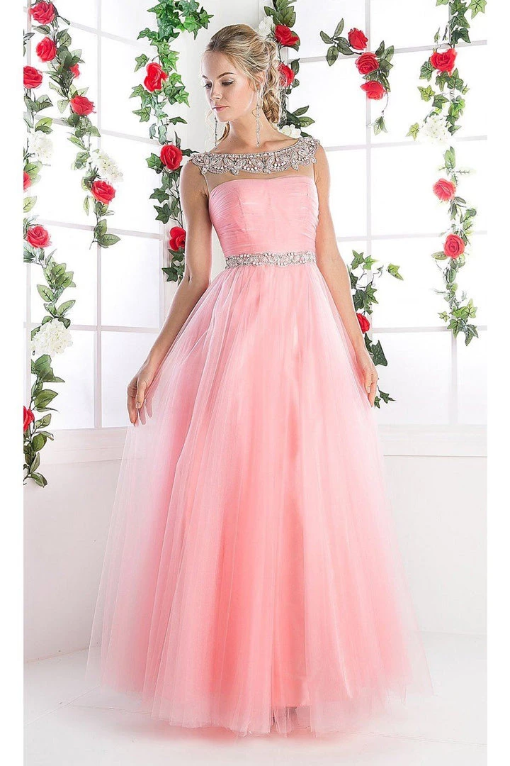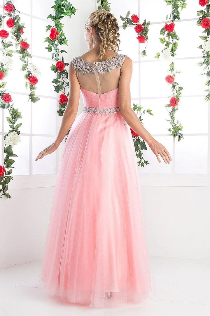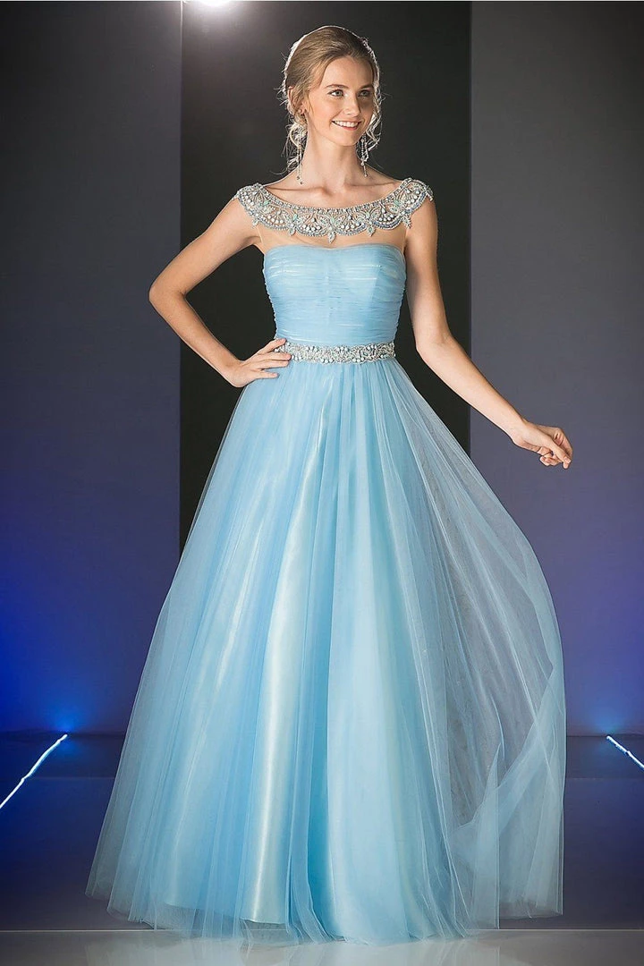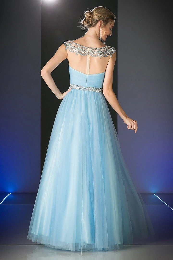 Look unforgettable in this beaded long cap sleeve tulle dress with A-line skirt by Cinderella Divine PC908.