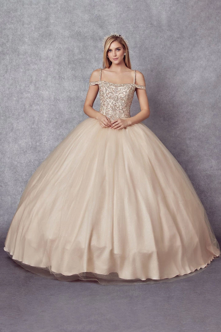 - Beaded Cold Shoulder Glitter Tulle Ball Gown by Juliet