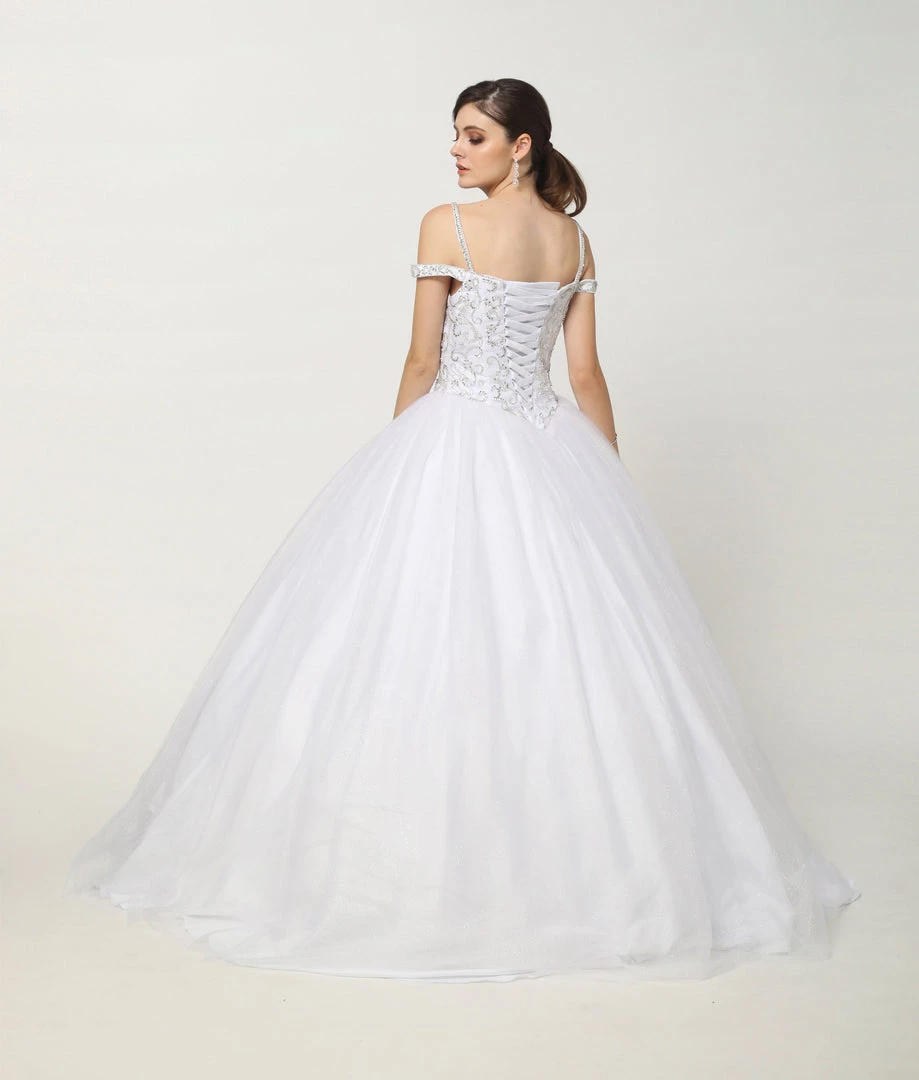 Be the center of attention in this beaded long cold shoulder dress with glitter A-line skirt by Juliet 1426. This beautiful ballgown features a cold shoulder bodice, open lace-up corset back, and a full length A-line skirt that ends in a sweep train.