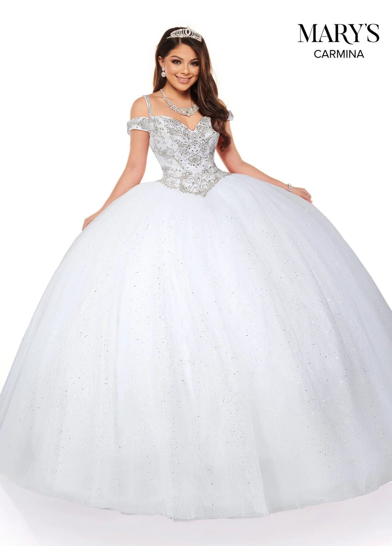 Light up the room in this beaded off the shoulder A-line ball gown by Mary’s Bridal MQ1001. This cold shoulder sparkling tulle quinceanera ball gown features sweetheart neckline, beaded bodice, beaded straps, basque waistline, a back lace-up closure, and comes with a matching bolero jacket.