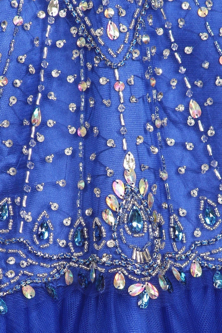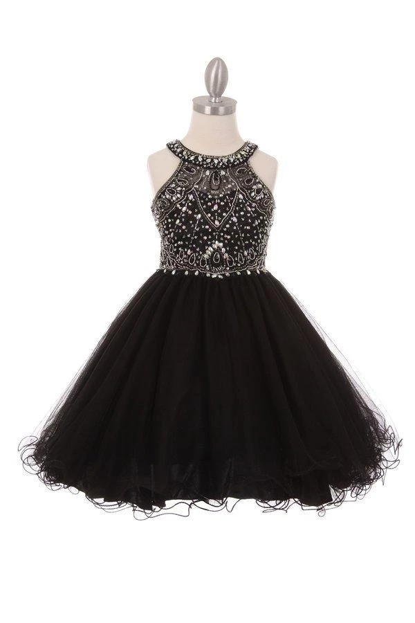 Your sweet girl will be selfie ready in this short ruffled tulle dress with beaded halter bodice by Cinderella Couture 5022. This beautiful jeweled tulle halter dress features a sheer bodice accented with rhinestone beads, tulle wired skirt with a curly hemline, open back cutout with lace-up corset, and a zipper closure.