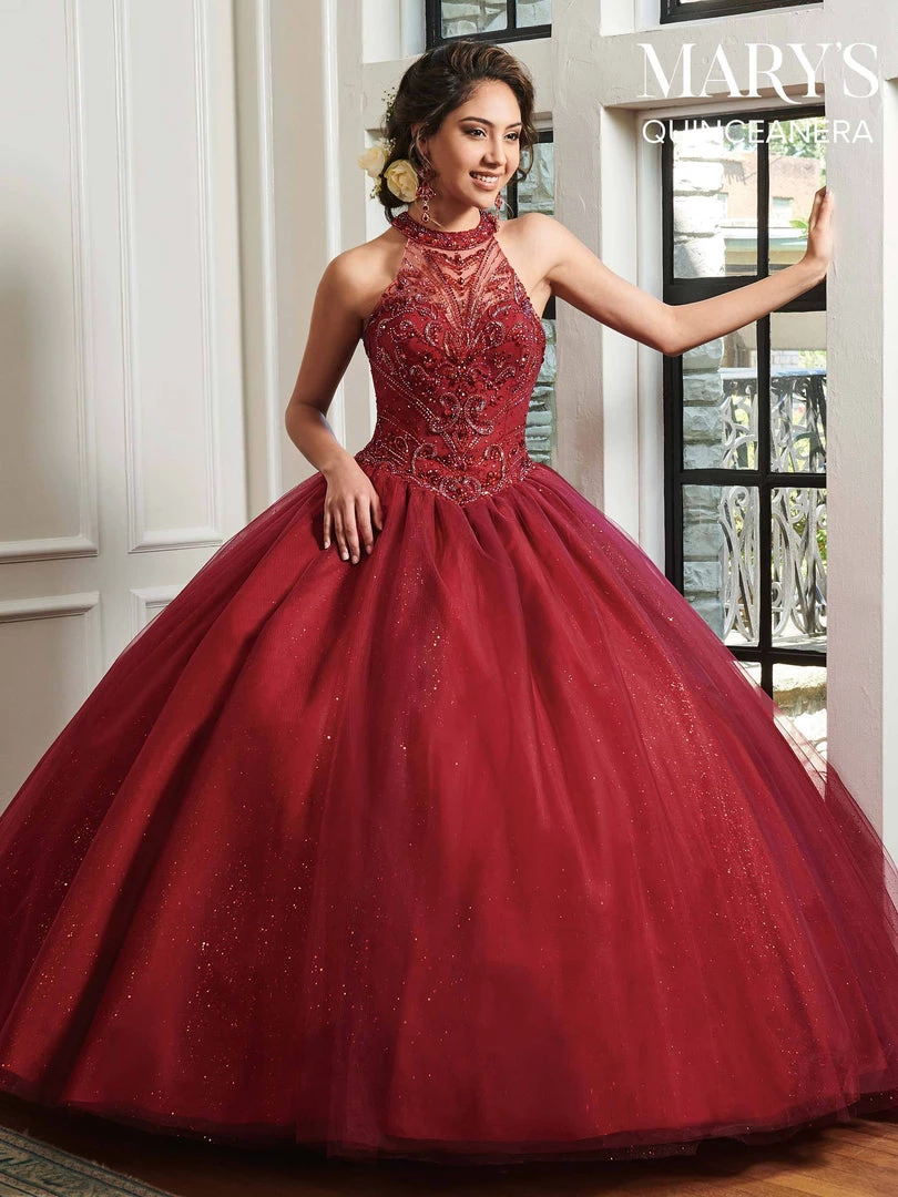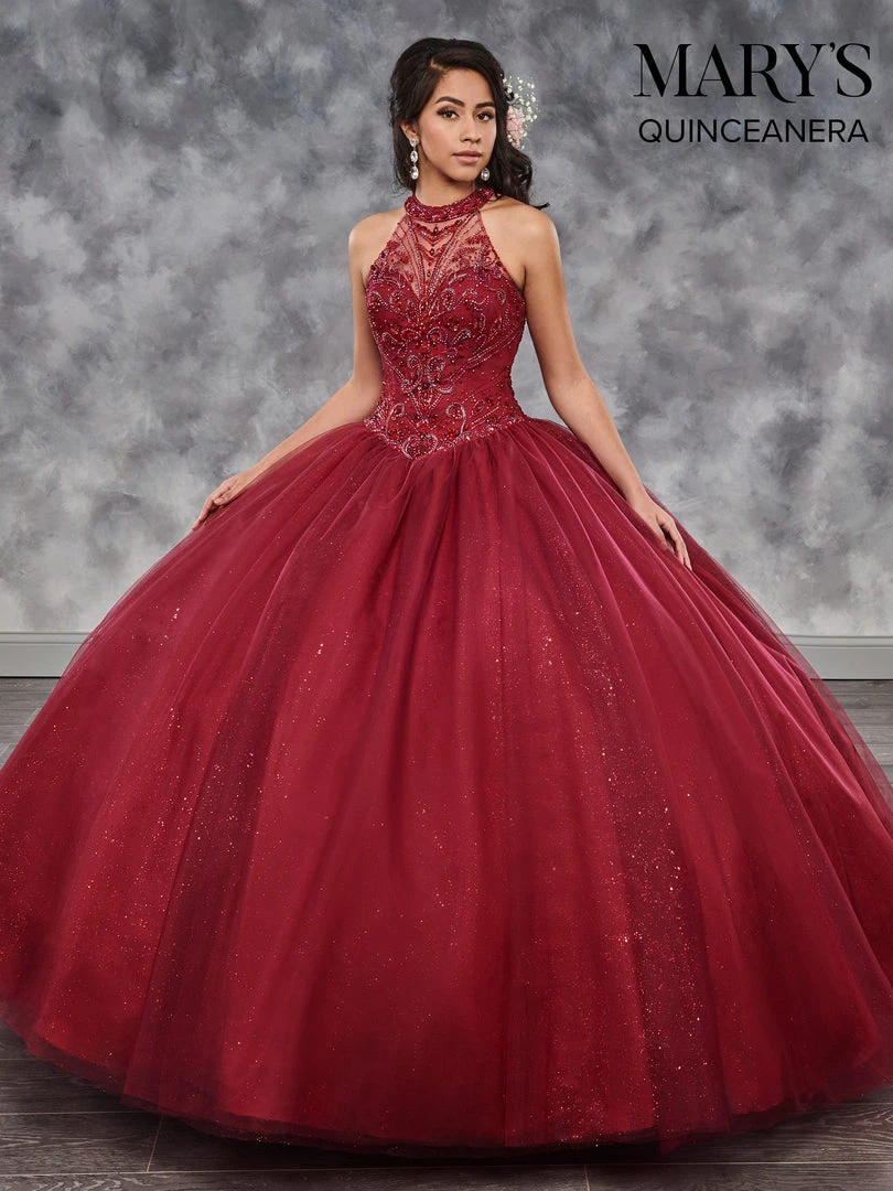 All eyes will be on you in this beaded long halter glitter tulle dress with A-line skirt by Mary’s Bridal MQ1019. Glitter tulle quinceanera dress features a sheer halter beaded top, basque waistline, open back with keyhole and lace-up closure, matching cape, and a sweep train.