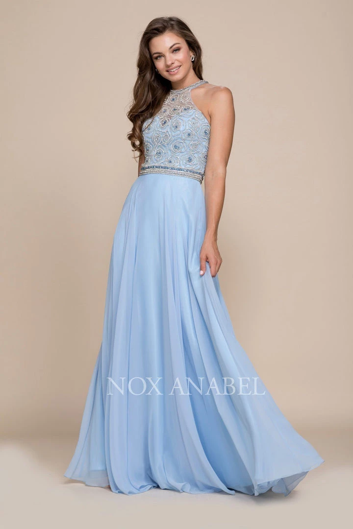 Radiate the room in an elegant beaded illusion neckline halter dress by Nox Anabel 8295. This long evening gown features a sheer illusion halter bodice decorated with a sparkly beaded design, open back, beaded waistband, and a zipper closure.