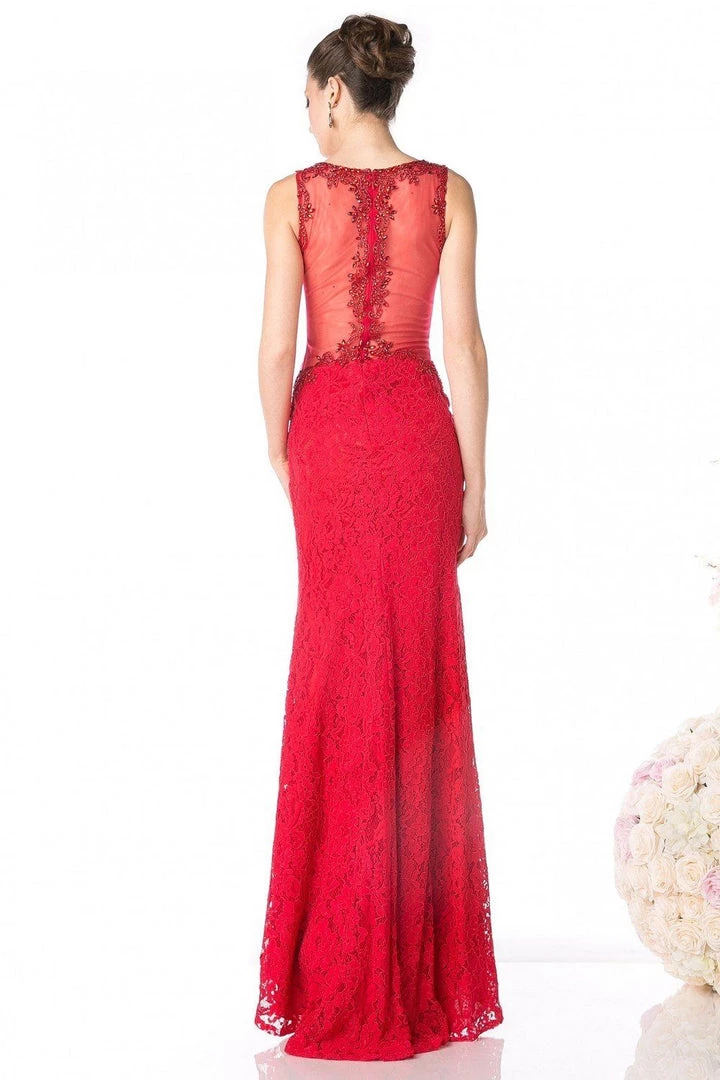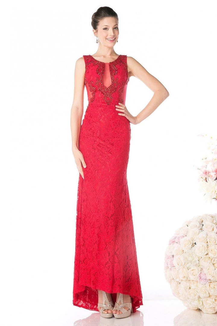 Look picture-perfect in this red long fitted lace dress by Cinderella Divine J742.