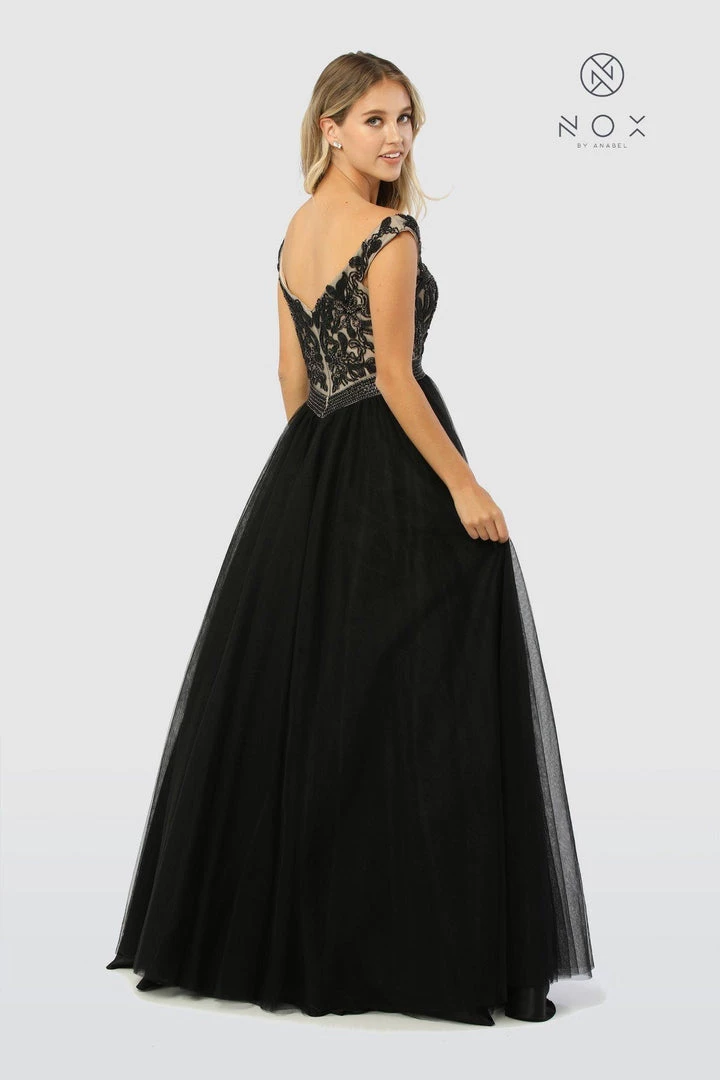 Look stunning in this black long off the shoulder dress with beaded bodice by Nox Anabel E166. We love this dress because it’s available in plus sizes!