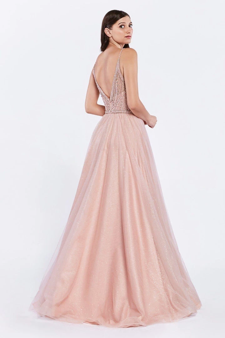 Sparkle under the stars in this long A-line glitter dress with beaded V-neck bodice by Cinderella Divine KC892.
