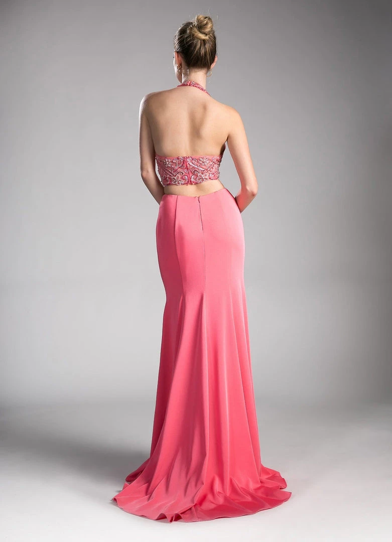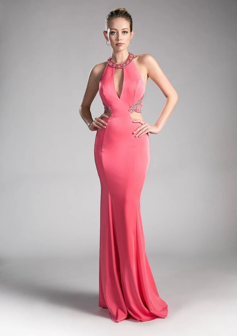 Look and feel amazing in this fitted long halter formal dress with beaded embellishments by Cinderella Divine 85201. This evening gown features a halter bodice secured with a front keyhole cut out, dazzling floral-shaped beads adorn the neckline and back, sexy side cut outs, a flirty open back, a floor length fit and flare skirt with a small train, and a zipper closure.