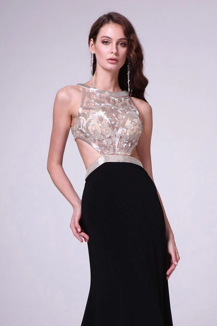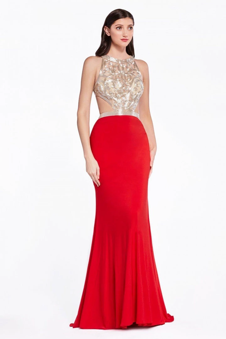 Look unforgettable in this sexy long illusion halter dress with fitted skirt by Cinderella Divine 959.