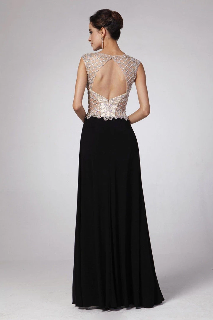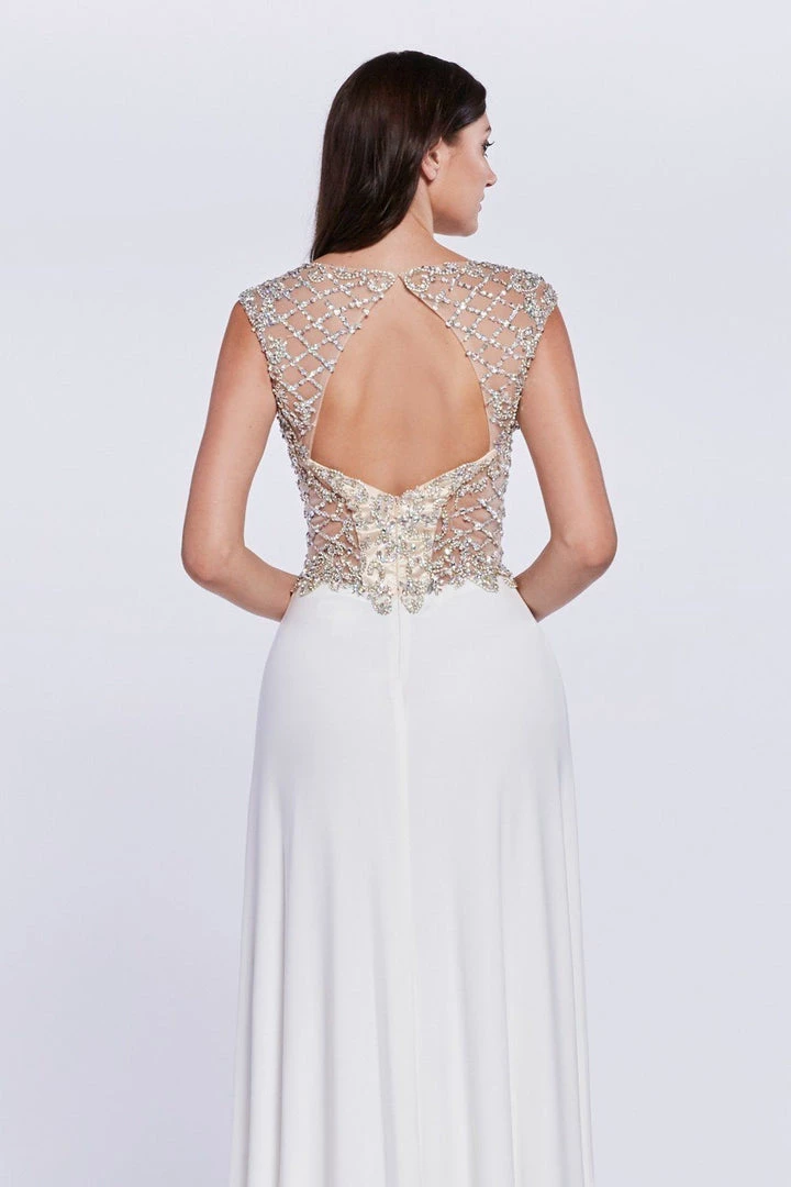 Look unforgettable in this beaded illusion cap sleeve gown by Cinderella Divine 8907.
