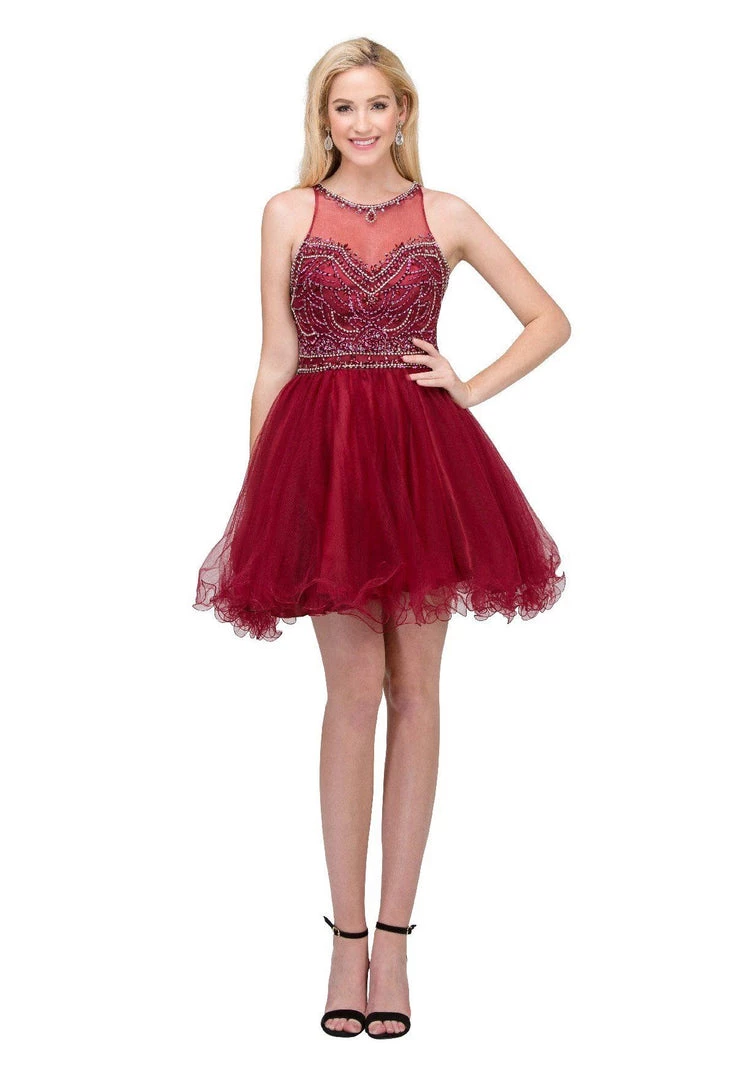 Look unforgettable in this beaded illusion cocktail dress with ruffled skirt by Star Box 17247. This beautiful short sleeveless dress features a sheer sweetheart bodice decorated in sparkly rhinestones and beads, embellished sheer back, short ruffled skirt with a curly hemline, and a zipper closure. Affordably priced at $179, this short party dress is perfect for any formal event and will keep you on budget!